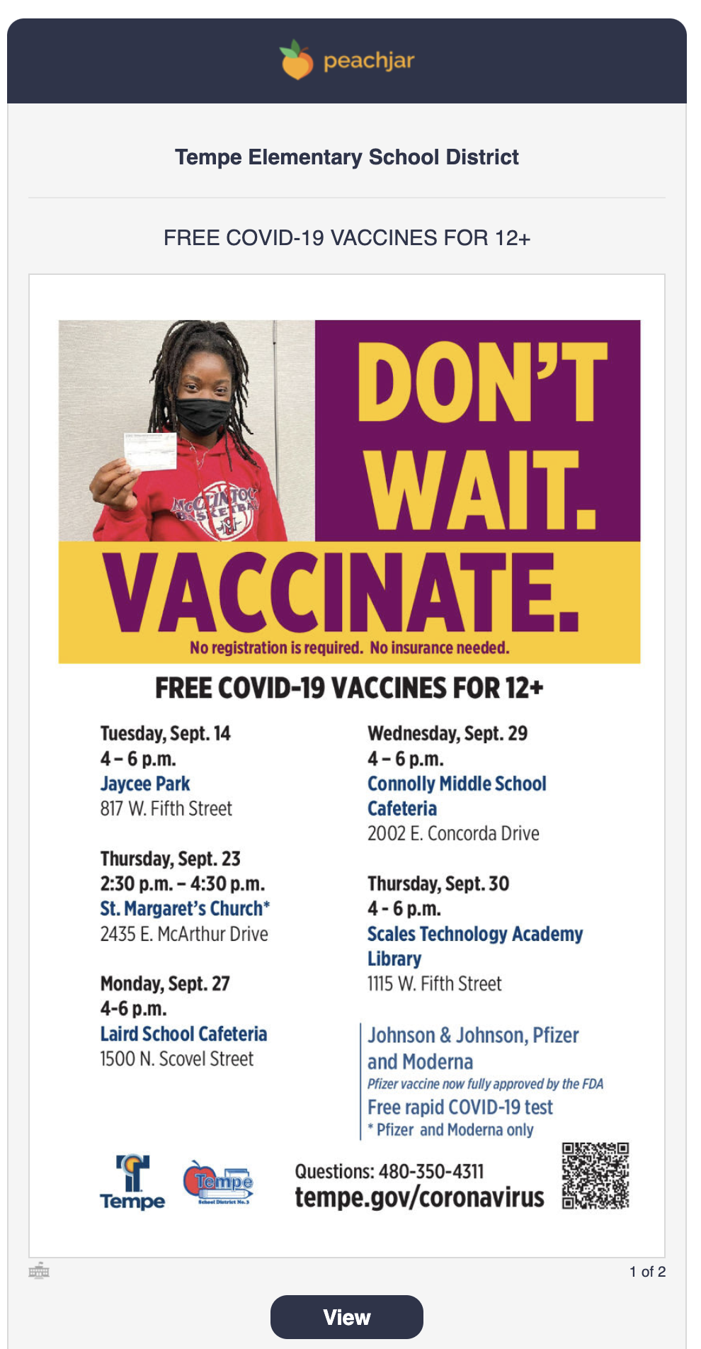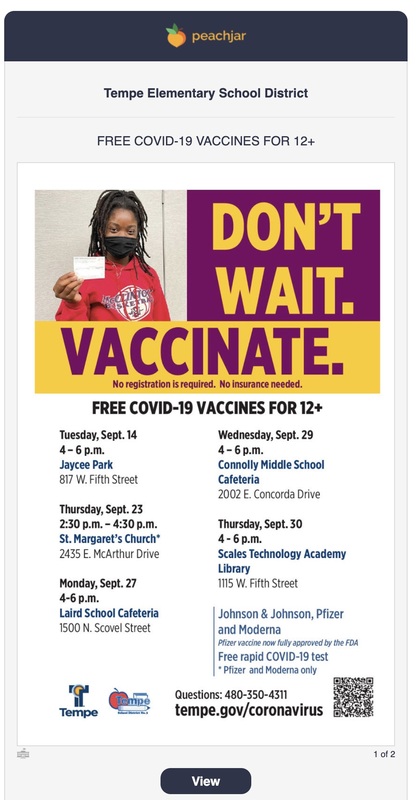 Tempe Public Schools sent this email today that includes information on free vaccines in Tempe, especially around Scales and Jaycee Park which are both in the same neighborhood.