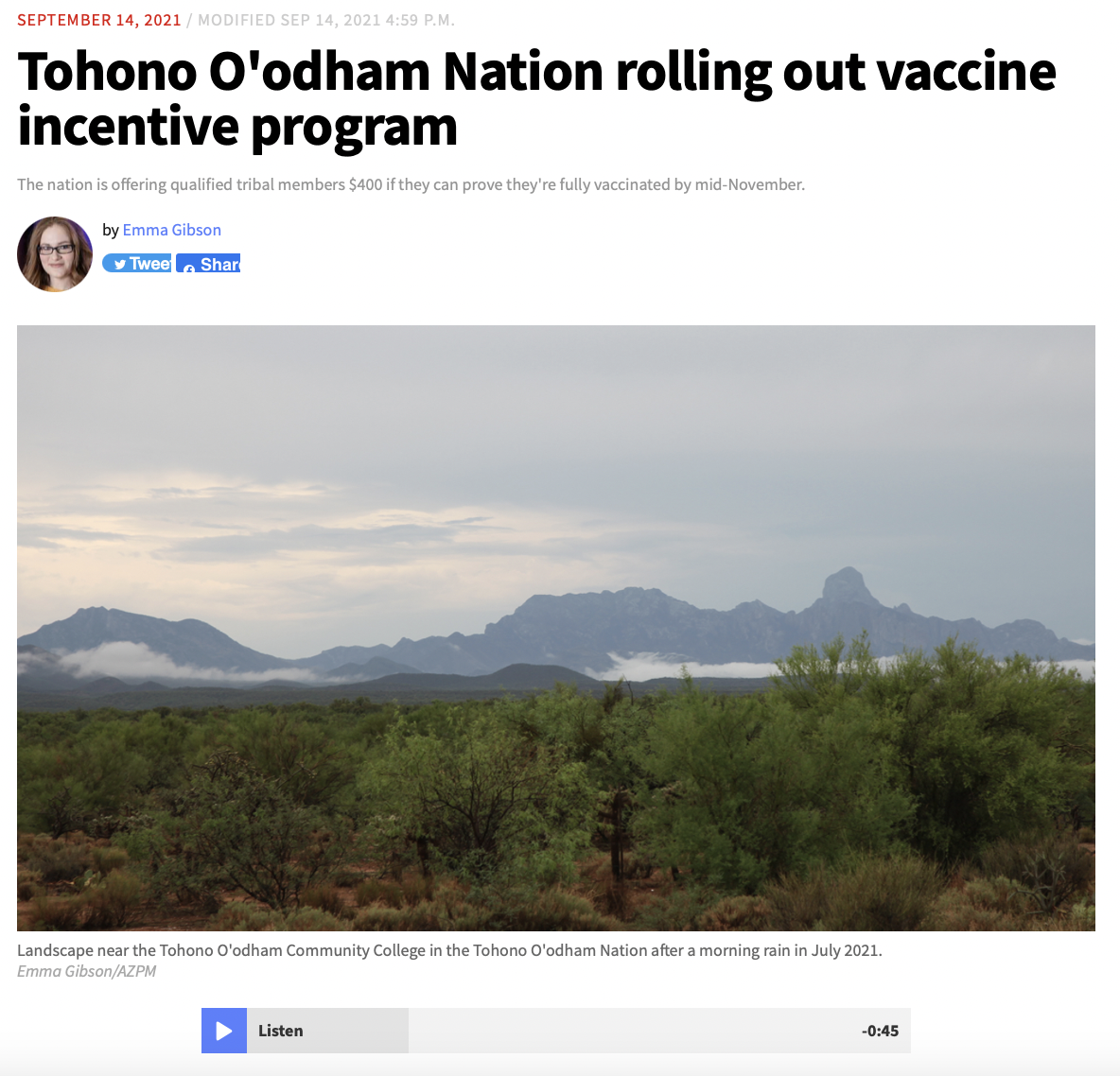 Efforts by the Tohono O'odham Nation to combat COVID-19 and increase the percentage of tribal members who are vaccinated. The Tohono O'odham Nation to pay tribal members $400 if they can prove they’re fully vaccinated against COVID-19 by mid-November.