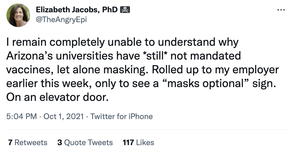 Elizabeth Jacobs (@TheAngryEpi on Twitter) regularly tweets about the pandemic. She has been vocal about the University of Arizona's mitigation strategy, specifically how the university will not defy Governor Ducey's ban on mask mandates. She is a professor of Epidemiology and Biostatistics at Arizona and has played a big role in the UA Vaccine POD and COVID-related research. She is particularly outspoken about vaccines and masks in education settings, not just at the university level but also for K-12.