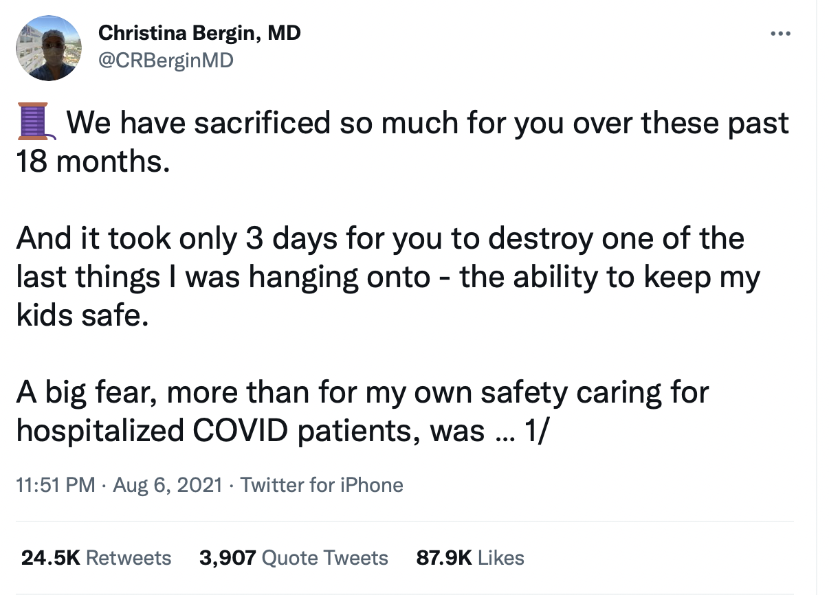 Dr. Christina Bergin shares a thread on Twitter after her child was exposed to COVID in the classroom. She provides a story about spending 18 months doing everything she could to not expose her family to COVID because of her work in a hospital, only to have her child exposed after three days of in-person learning at school. She addresses her tweets to Arizona Governor Doug Ducey, who (with the legislature) have attempted to prevent schools from instituting mask mandates and have threatened to withhold federal COVID relief funding that the state is supposed to disburse to Arizona school districts.