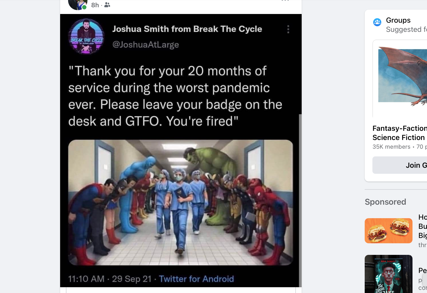 While perusing facebook, I came across this meme about healthcare workers being threatened with termination if they refuse to get vaccinated.