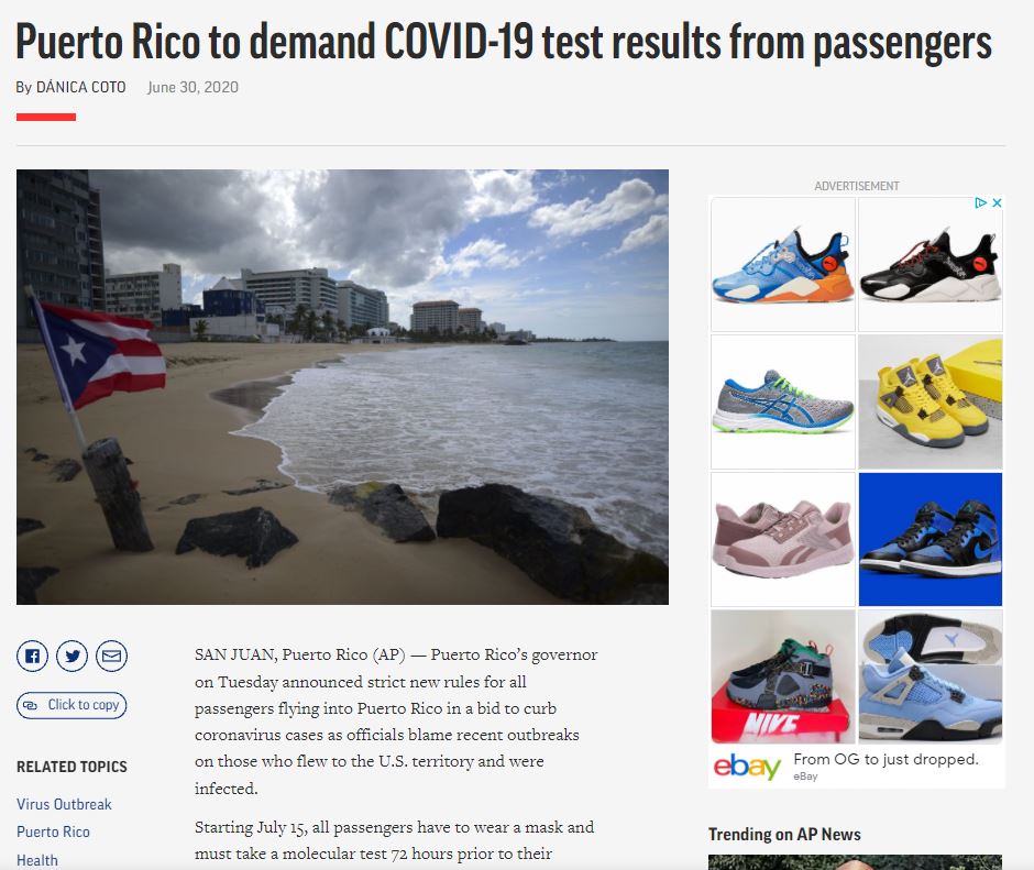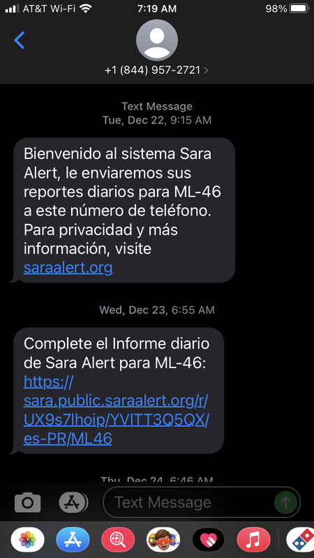 Beginning July 15, 2020, the governor of Puerto Rico ordered all tourists to show a negative, molecular Covid test in order to enter the island. The governor had tried to close down all US mainland flights from coronavirus hotspots but the FAA did not respond to her request. Instead, the governor required tourists to show proof of a negative Covid test, using this QR code (above), in order to leave the airport. Throughout one's stay in Puerto Rico, the government texted/emailed everyday asking for any symptoms. For the first several months, the questions were only in Spanish (above).