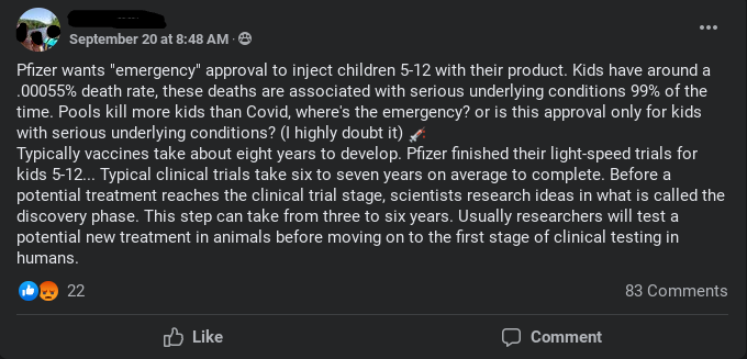 I have a screenshot of several anti-vax debates from my town's FB group. The poster was against vaccinating kids.