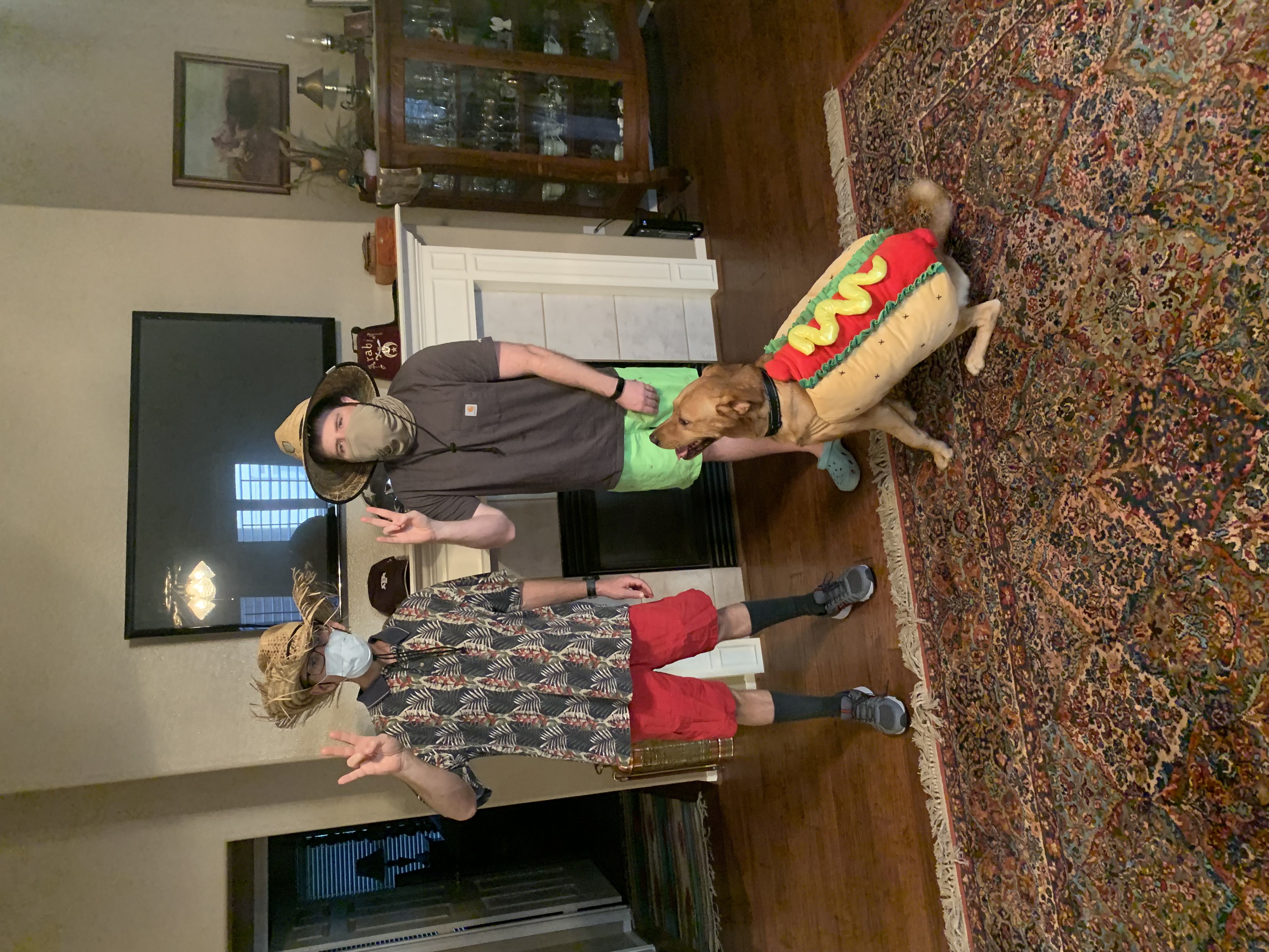 Our experience through Covid and the lockdowns have greatly affected every aspect of social life from 2020 through 2021, this is a photo of Alan Montgomery (left) and Jake Montgomery (right) getting ready to celebrate Triggers (the dog) adoption and birthday via Hawaiian theme.