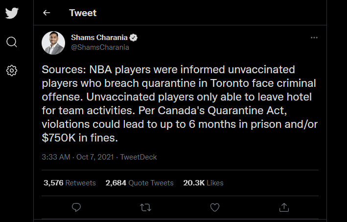 this is a social media post that describes how NBA players that are unvaccinated cannot travel outside of their hotel when playing in Toronto Canada unless it is related to team activities. If they break quarantine they face criminal charges.