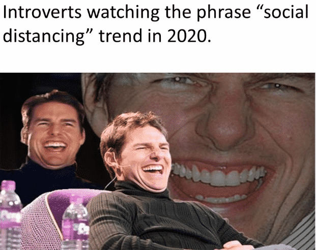 I was scrolling through memes and this one adequately describes my reaction to social distancing at the beginning of the pandemic. I felt like my time had finally come when we had to begin social distancing and staying at home. I'm not a very social person so I was happy being in my little bubble.