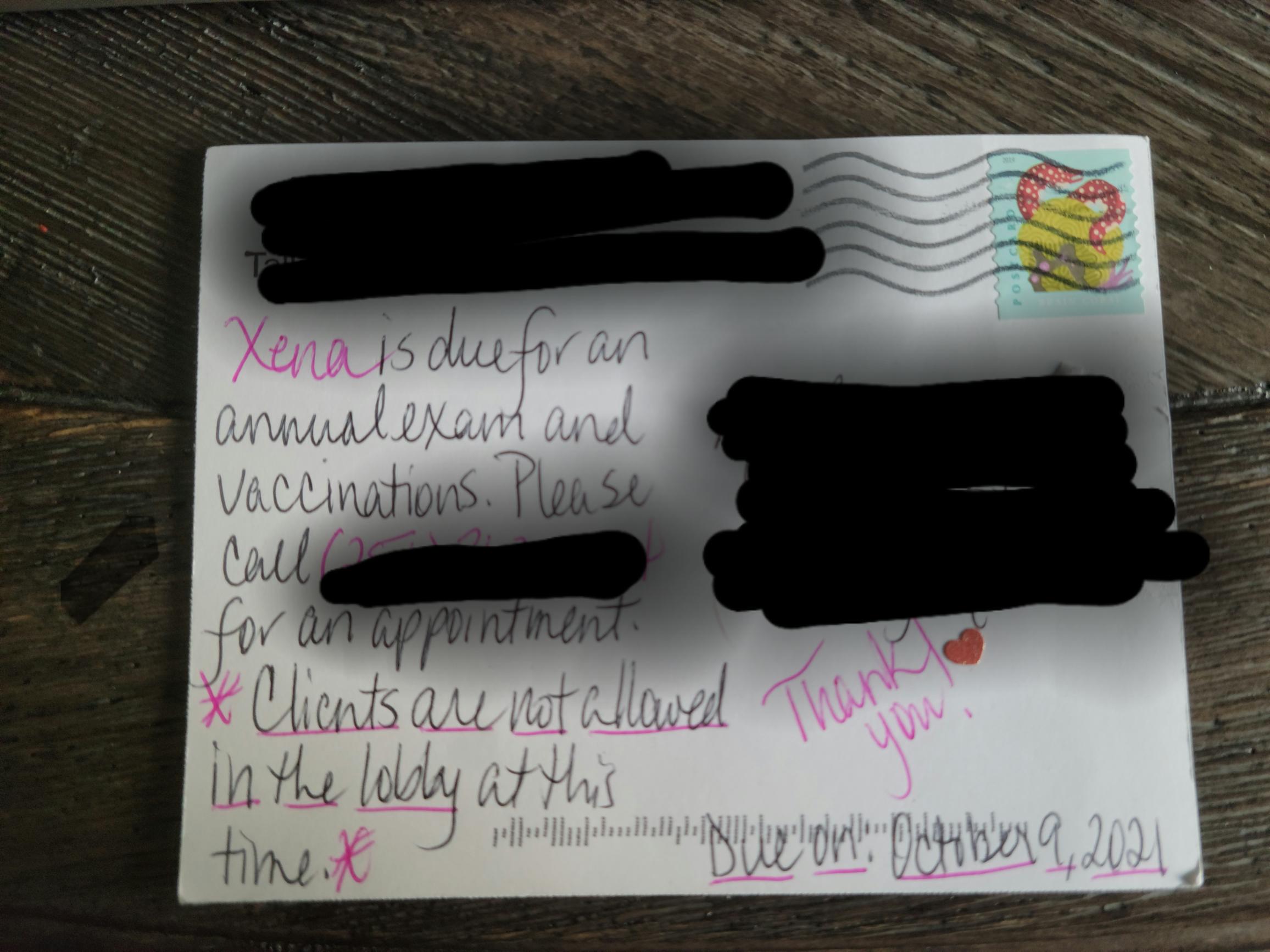 My dog has her yearly vet appointment coming up and this arrived in the mail. It says clients must stay outside and someone from the office will collect your pet. That's fine but when you have a giant 80 pound dog full of anxiety like I do, it isn't going to be an east task for them. Previously, one person was allowed to sit and wait while their pet received treatment because they spaced out their appointments accordingly and it wasn't an extremely busy place anyway. The room where the pets go for their check-ups was pretty close to the door so I would always talk to my dog to calm her down. I won't be able to do that for this visit and it's making me anxious because I know my dog will be upset. This is the vet's procedure and we have to follow it no matter our feelings. I know she'll be okay but it still makes me nervous.