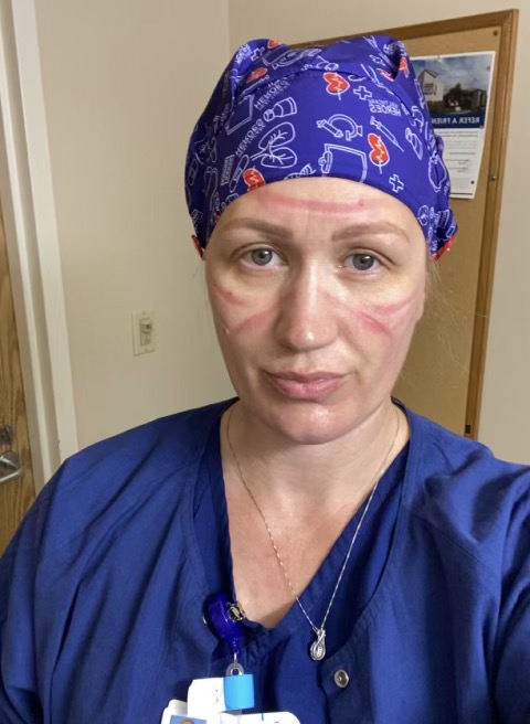 This photo is an important reflection of what healthcare providers have had to endure and the lasting physical and mental toll the pandemic has taken. It was taken after a 12 hour shift of wearing PPE non-stop.