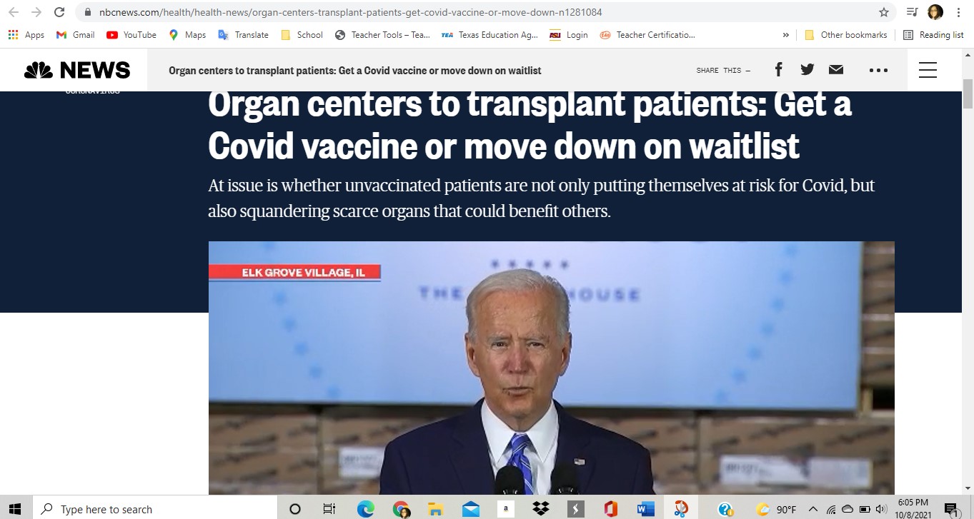 This article discusses the debate between patients who are unvaccinated and those who are vaccinated. Should it be a requirement for a transplant patient to get the vaccine? Being unvaccinated puts not only the patient at-risk for contracting COVID-19, but it exposes doctors, nurses, and other patients as well. Several states have already made it a requirement to get the vaccine before being placed on the organ transplant list.