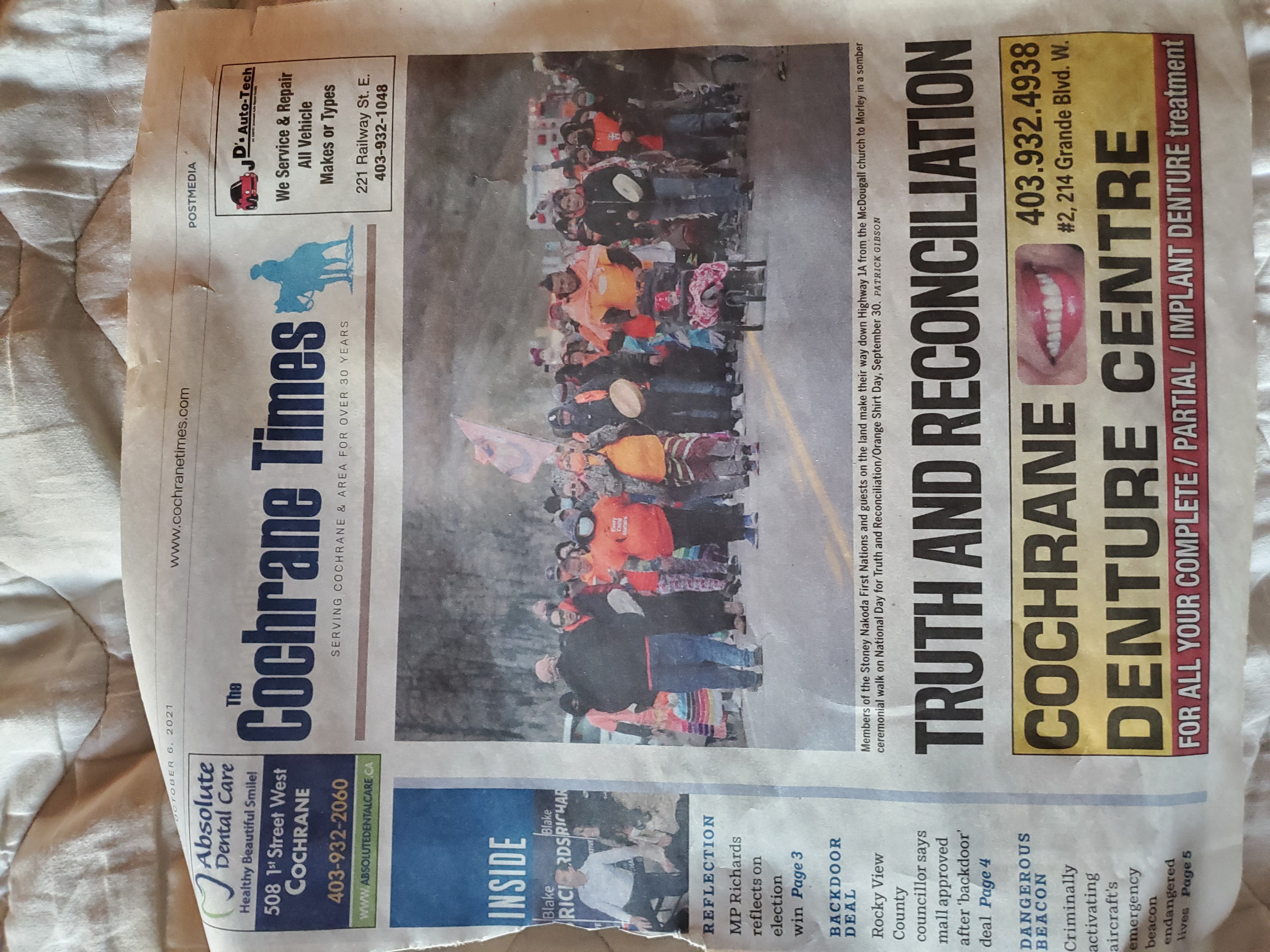 1.) This is the FrontPage paper for the Cochrane Times newspaper on October 6th, 2021. The front page’s photo content is as follows: “Members of the Stoney Nakoda First Nations and guests on the land make their way down Highway 1A from the McDougall church to Morley in a somber ceremonial walk on National Day for Truth and Reconciliation/Orange Shirt Day, September 30”
