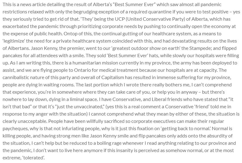 This is a news article detailing the result of Alberta’s “Best Summer Ever” which saw almost all pandemic restrictions relaxed with only the begrudging exception of a required quarantine if you were to test positive – yes they seriously tried to get rid of that. ‘They’ being the UCP (United Conservative Party) of Alberta, which has exacerbated the pandemic through prioritizing corporate needs by pushing to continually open the economy at the expense of public health. Ontop of this, the continual gutting of our healthcare system, as a means to ‘legitimize’ the need for a private healthcare system coincided with this, and had devastating results on the lives of Albertans. Jason Kenny, the premier, went to our ‘greatest outdoor show on earth’ the Stampede; and flipped pancakes for all attendees with a smile. They sold ‘Best Summer Ever’ hats, while slowly our hospitals were filling up. As I am writing this, there is a humanitarian mission currently in my province, the army has been deployed to assist, and we are flying people to Ontario for medical treatment because our hospitals are at capacity. The cannibalistic nature of this party and overall of Capitalism has resulted in immense suffering for my province, people are dying in waiting rooms. The last portion which I wrote there really bothers me, I can’t comprehend that experience, you’re in somewhere where they can take care of you, or help you in anyway – but there’s nowhere to lay down, dying in a liminal space. I have Conservative, and Liberal friends who have stated that “it isn’t that bad” or that it’s “just the unvaccinated,” (yes this is a real comment a Conservative ‘friend’ told me in response to my anger with the situation) I cannot comprehend what they mean by either of these, the situation is clearly unacceptable. People have been willfully sacrificed so corporate executives can make their regular paycheques, why is that not infuriating people, why is it just this fixation on ‘getting back to normal.’ Normal is killing people, and having strong men like Jason Kenny smile and flip pancakes only adds onto the absurdity of the situation, I can’t help but be reduced to a boiling rage whenever I read anything relating to our province and the pandemic, I don’t want to live here anymore if this insanity is perceived as somehow normal, or at the most extreme, ‘tolerated’.