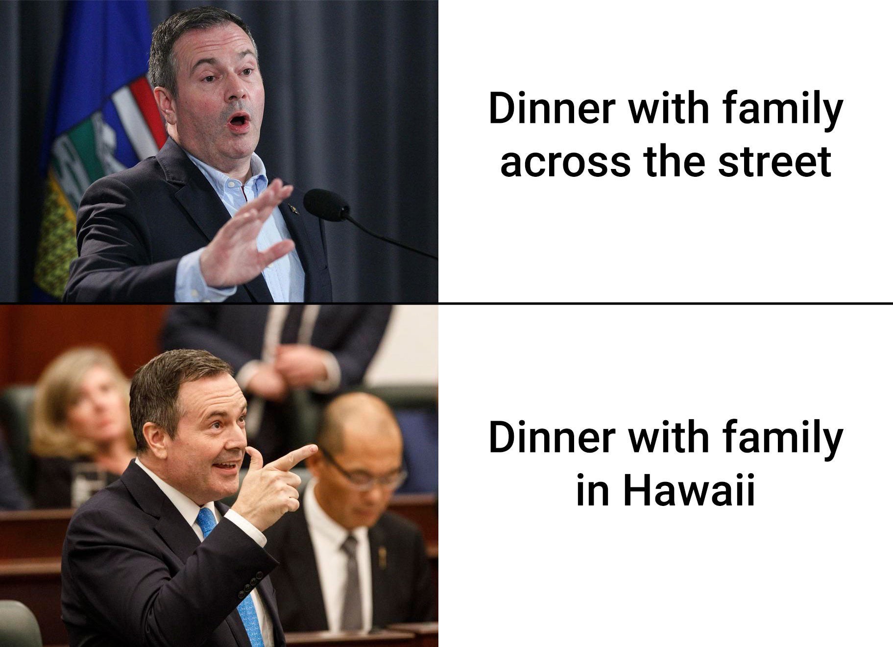 A meme referencing either how members of the UCP of Alberta going on vacation during the worst months of the pandemic, or our Premier's vacation during the onslaught of the 4th wave. I guess it's even funnier based on the fact that this can represent multiple instances.