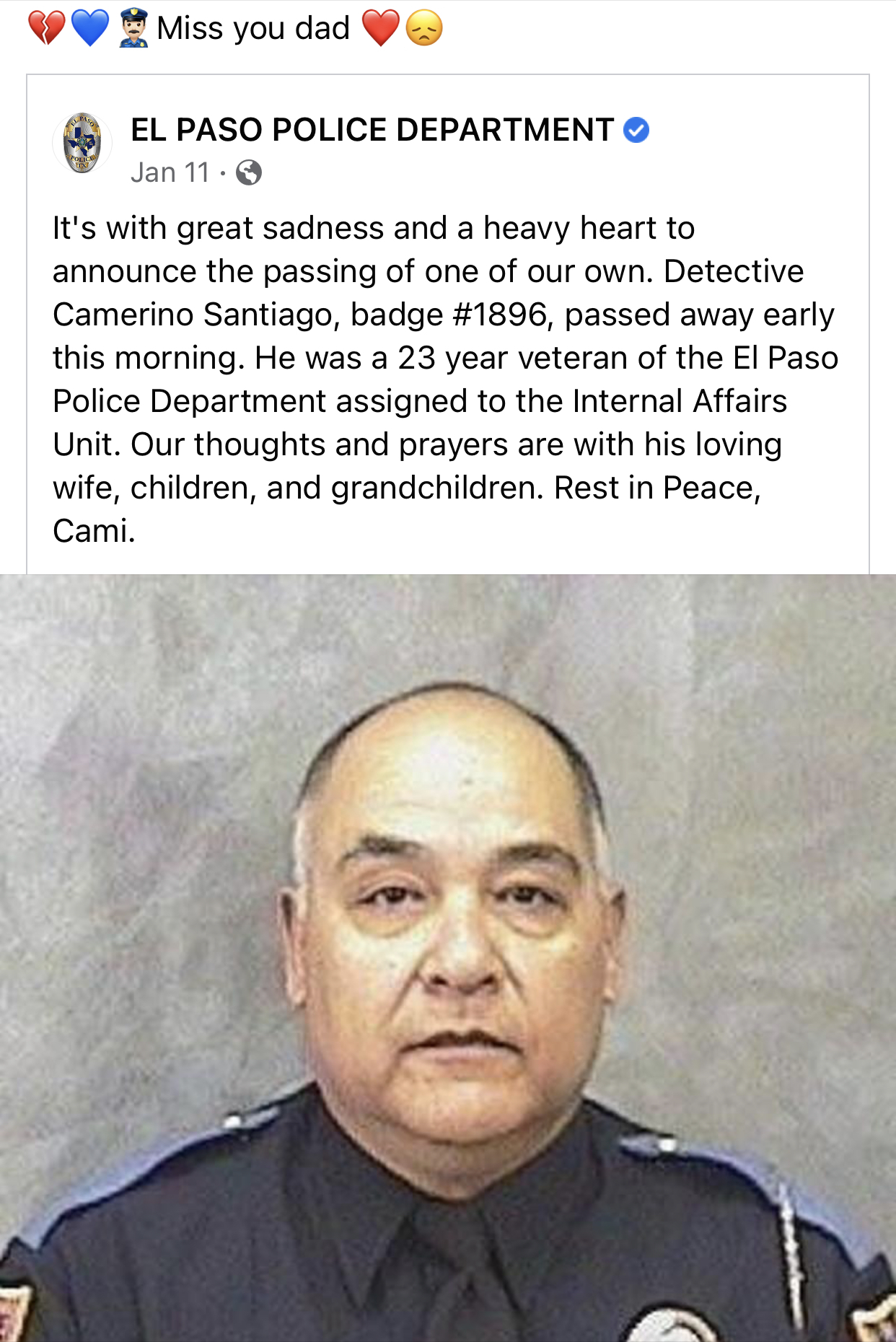 After a month of battling Covid-19, my father passed away due to complications caused by the virus. He was due to retire in January 2021. He worked for the El Paso Police Department for 23.5 years. His passing hit us all hard and it was unexpected as the doctors had told us several days before that he would make it. Then he took a turn for the worst. When his co-workers asked what did he look forward to in his retirement, he said spending time with his family and his granddaughter. We still miss him to this day, especially as the holidays approach.