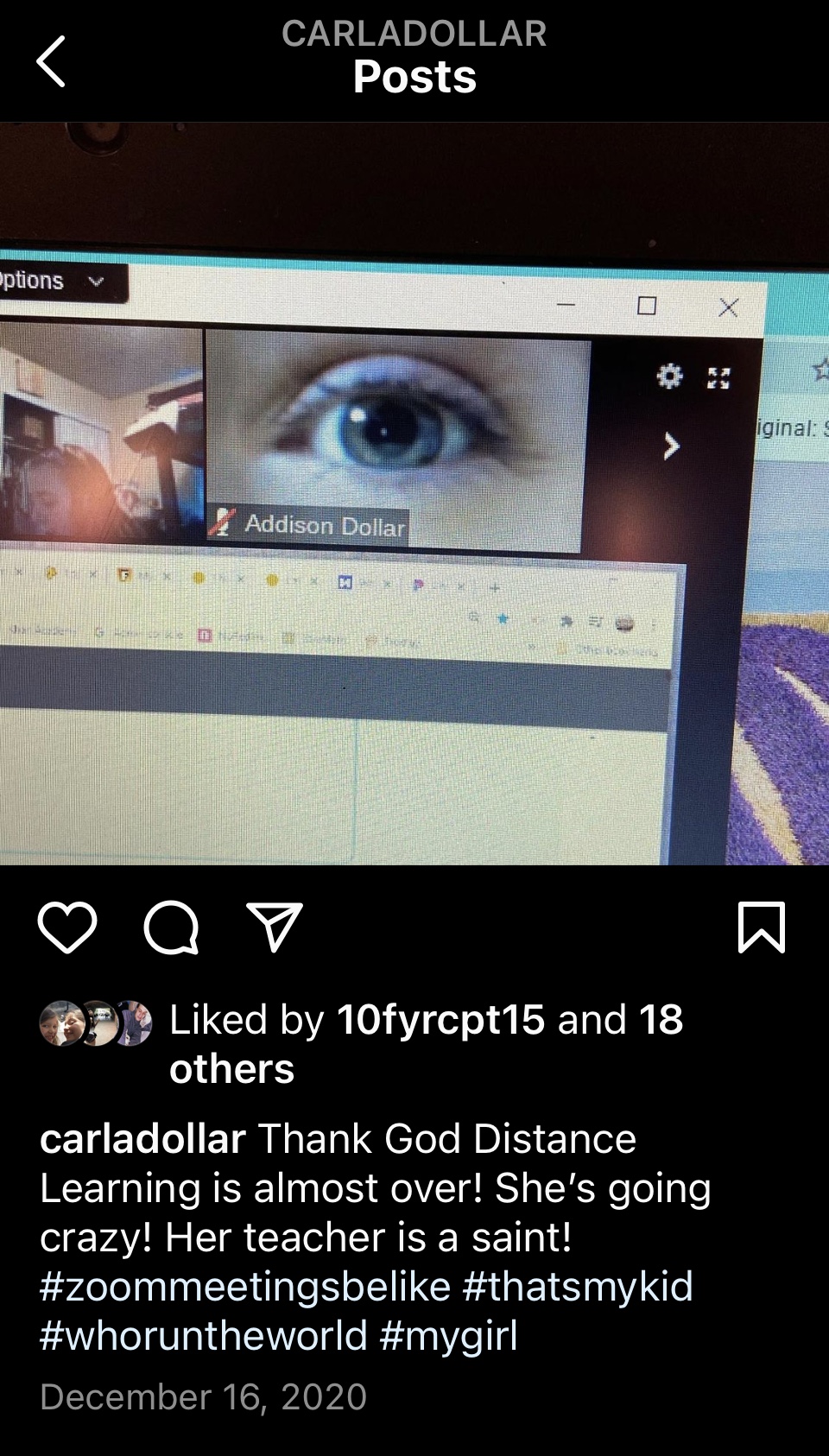Distance Learning was not for the faint of heart. My very social daughter struggled with distance learning because she needs people. This picture I posted on Instagram. Her teacher was a saint to be able to reach the kids even though he knew full well they were going a bit crazy at home.