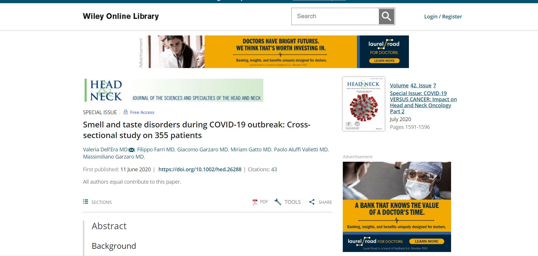 Smell and taste disorders during COVID‐19 outbreak: Cross‐sectional study on 355 patients, Dell’Era, Valeria ; Farri, Filippo ; Garzaro, Giacomo ; Gatto, Miriam ; Aluffi Valletti, Paolo ; Garzaro, Massimiliano, 2020 (Hoboken, John Wiley and Sons, Inc. Head & neck, 2020-07, Vol.42 (7), p.1591-1596).