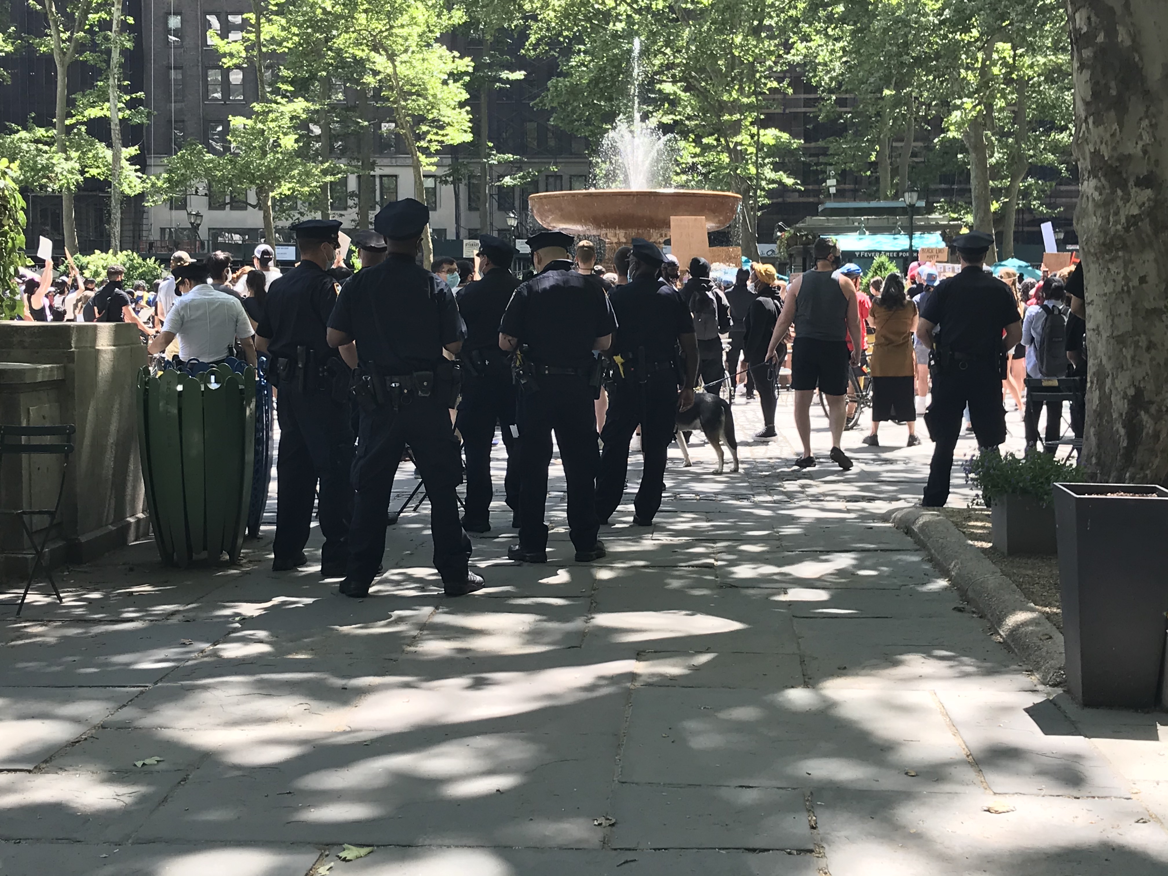Images taken of signs held while listening to speeches from BLM activists. Another image shows a cluster of police during a demonstration in Midtown Manhattan.