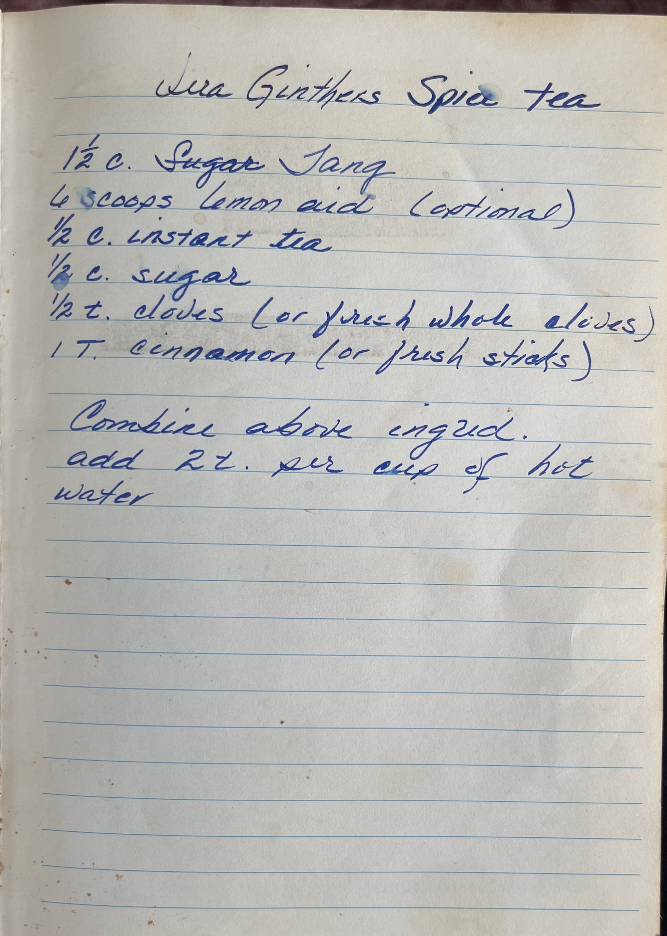 Some of my earliest memories are of the sights, sounds, and tastes of my grandmother’s kitchen. She passed away almost exactly one year before the stay-at-home order was put in place in Washington State. At that time, I was already an online student working from home and my partner was driving across the state every weekend to work and come back home. When lockdown started, I didn’t realize how cooped up I would feel. I decided I needed to revisit the feelings of my grandmother’s kitchen. Around the same time, my family got a trailer full of boxes of my grandmother’s things. In this box was a handwritten cookbook filled with the recipes and stories from my childhood. There were handwritten letters from my great-grandfather to my grandmother, recipes she had clipped out of newspapers in the 1970s and 1980s, and family recipes I thought were lost when she passed. One of which was a Spiced tea, also known as friendship tea, recipe. For me, this tea is the epitome of Christmas time spent with my grandma. This recipe exists on the internet, but it was never as good as the one my grandmother made.