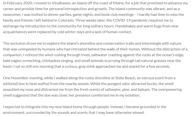 One November evening, while I walked along the rocky shoreline at State Beach, an estrous scent from a whitetail doe in heat wafted from the nearby woods. While the pungent odor attracted bucks, the smell assaulted my nose and distracted me from the fresh scents of saltwater, pine, and balsam. The overpowering smell suggested that the doe was close; her presence comforted me in my isolation.