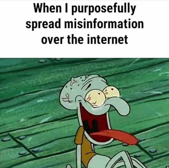 Sometimes I feel as though the people grifting off of the pandemic and people willingly sharing misleading information for political reasons just do not care about the harm being caused. It is also strange because many people seem to enjoy, like Squidward here, being a bearer of “fake news”.