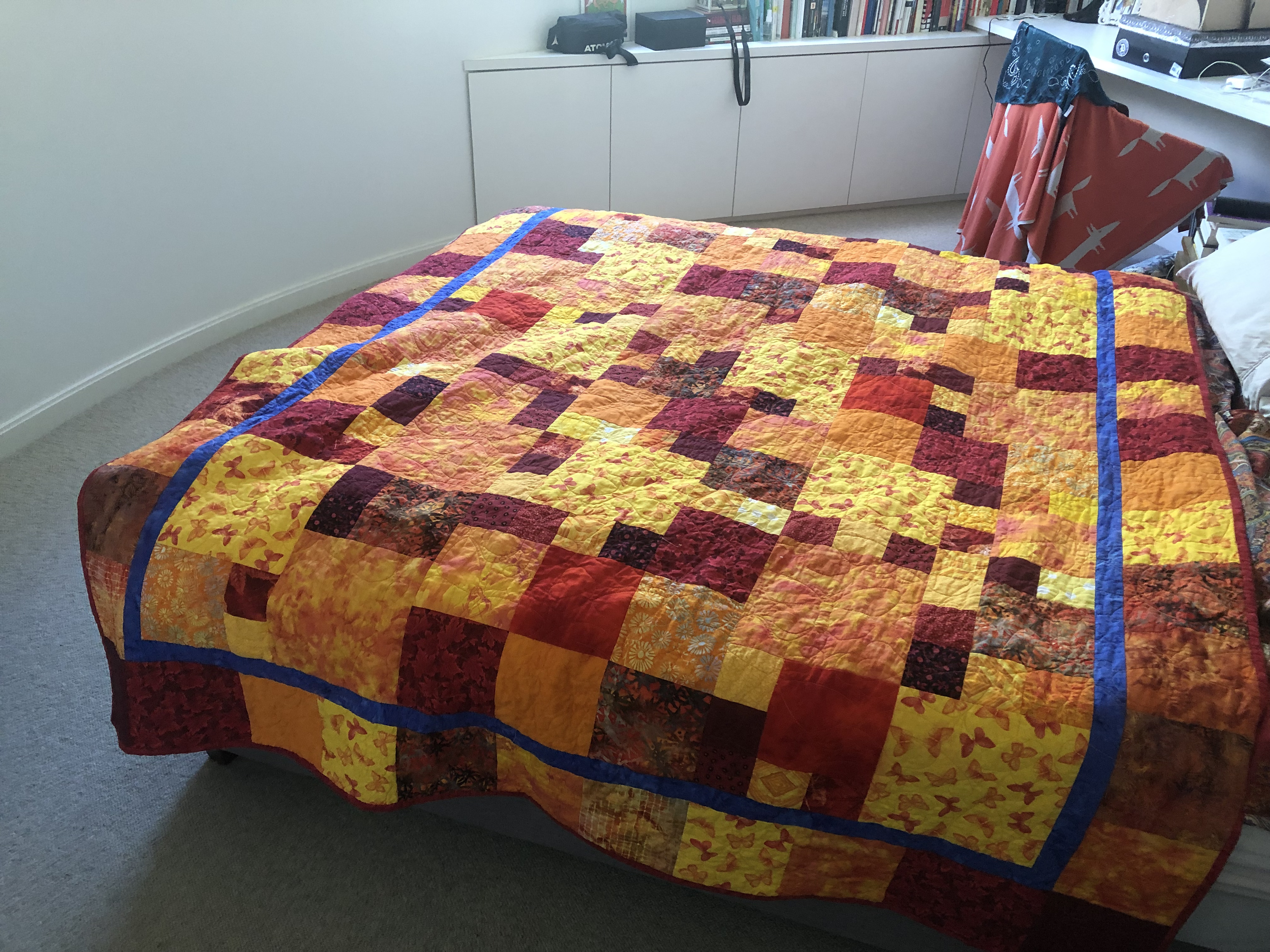 Last year (2020) I was living at home with my parents. My mum noticed how the pandemic was affecting me mentally and suggested that I make a quilt as a therapeutic tool. It was my first ever quilt, and it took several months. I enjoyed making it so much that I've kept on making quilts ever since. This quilt, therefore, reminds me of the pandemic's silver linings; it forced me to take up a hobby, one that slows me down. This photo is of the quilt on my bed now in Melbourne (2021).