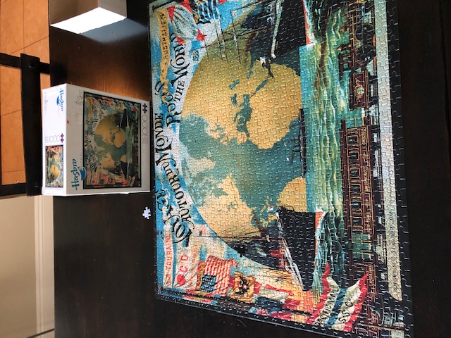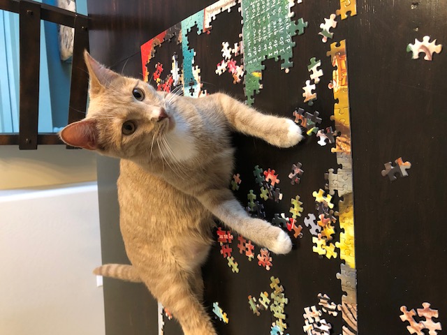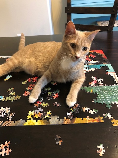 So many things about the pandemic has been (and continues to be) traumatizing and negative and irritating. But looking back through my phone I saw a photo from the first puzzle I did in April 2020, and then the first photo of our Pandemic Pet, Sunny, from October of that year. So, instead of focusing on the disruptions, today I will focus on two good things from the pandemic. Putting together puzzles has been a fun, stress-relieving activity for me, and I continue to have a puzzle going on our rarely used table even if our lives are back to full busy mode. So that is a hobby I picked up during the pandemic that I can see continuing long into the future. Also, the kitty has brought fun and cuddles to our family, and we all love her (except, perhaps, the dog). Getting a cat was not on our radar until we were locked down and sad. So, for now, I am thankful for puzzles and kitties.