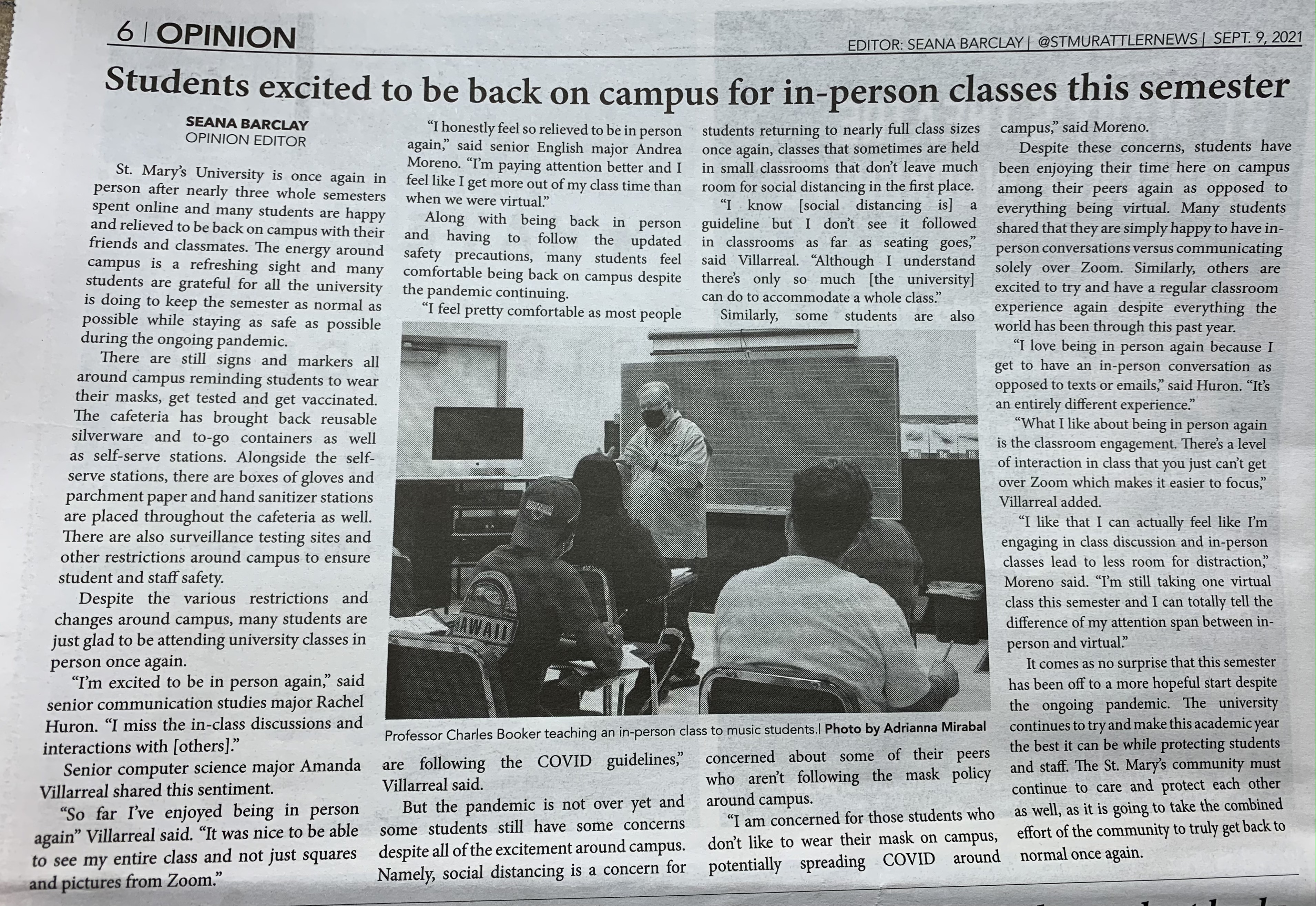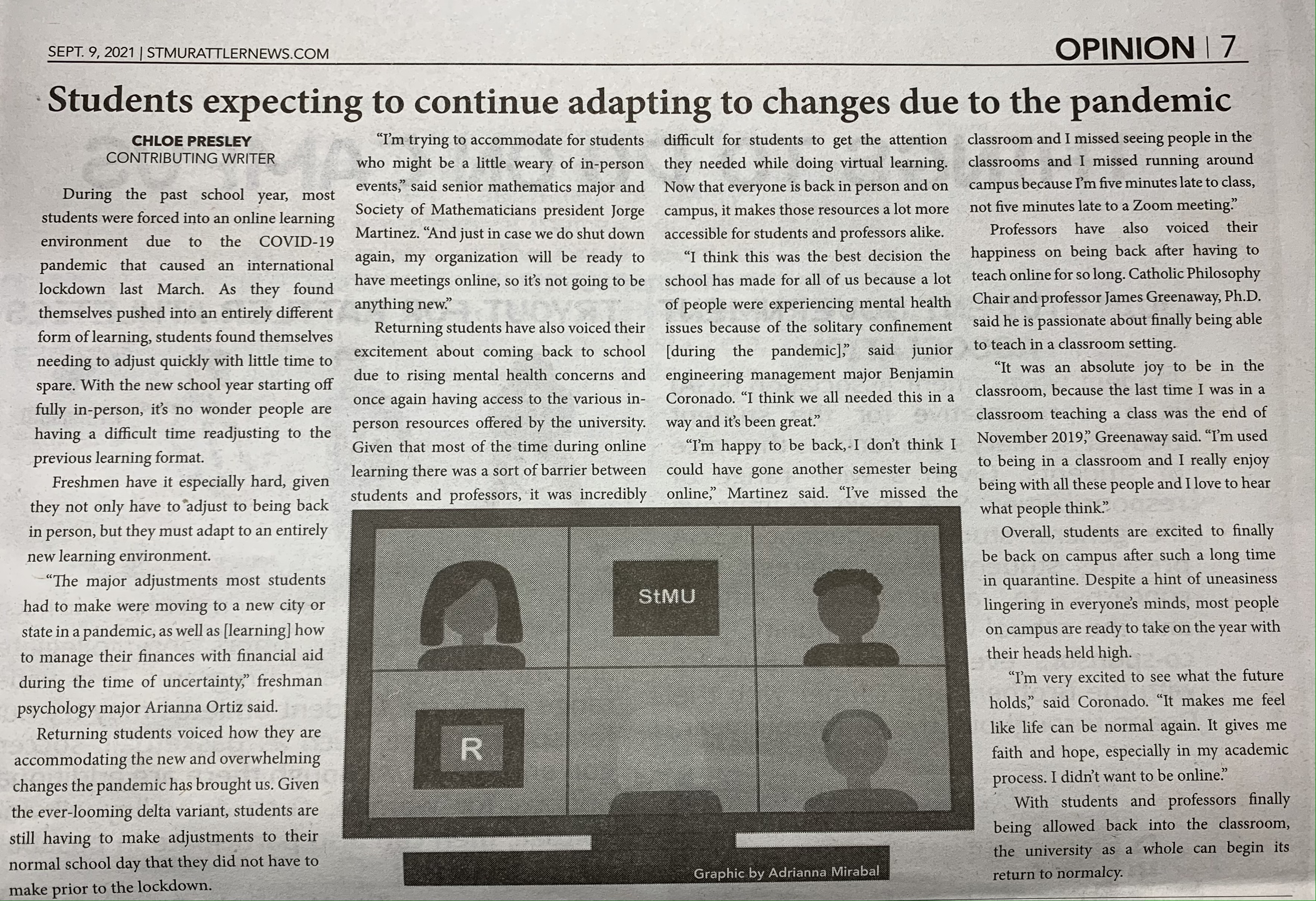 These text stories are from St. Mary University's Rattler Newspaper. These articles relate to the pandemic and my theme because they are discussing how students are adapting from the previous year(s), whether it be dealing with changes to online vs. in-person lectures, new policies to promote safety, or anything else. This theme is important to me because I was still in high school during the start of the pandemic, so I had to go through lots of adaptations, not only because of my transition into college but also because of the ongoing pandemic. When I decided to attend St. Mary's, lots of things were still uncertain, for example, whether or not class will be held in person or virtually, mask and vaccination mandates, etc. Chloe Presley is the contributing writer, and Adrianna Mirabal is responsible for the graphics.