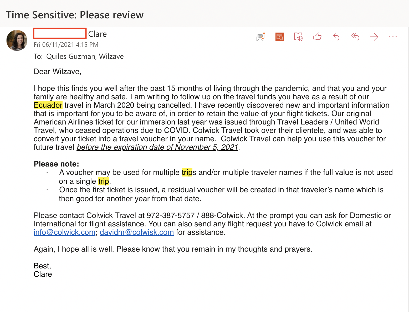 Each of the members of the flight to Guayaquil, Ecuador, was deeply connected with the purpose of traveling which was to be present with the neighbors in Ecuador. Some of us thought that the main purpose of the course, Empower: Ecuador, was to travel. To some extent it was, but after the trip cancelation, we realized there was also another greater purpose. The greater purpose was to grow in vulnerability, spirituality, and in self-reflection. To learn how to be vulnerable with others and share your journey in life and understand how God was working through all the messiness was really hard, but through this course, it happened. The trip cancelation was very sad but because of it, we learned how to be connected despite the distance. Letters were sent from us to each of the neighbors in Ecuador, zoom meetings were held with the team in different ways, and journals were written with our most inner thoughts and reflections. Additional to this, each of us got a voucher to travel for the rest of the year, which in my case I used to travel to see my loved ones in Puerto Rico and Arizona. Seeing my loved ones probably wouldn't have happened if it was not for this voucher and I was very grateful for it. Yes, it was bad that our trip was canceled but many blessings came out of this. During COVID-19 many bad things happened and are happening, however, many blessings and good things also happened and are happening. I think it is very important to also share those good things to motivate others and push each other up out of all the darkness. To express this story I am sharing a screenshot of an email that confirmed the trip cancelation and that also announced to us that we were going to have a voucher to travel. The email was from our leader Clare.