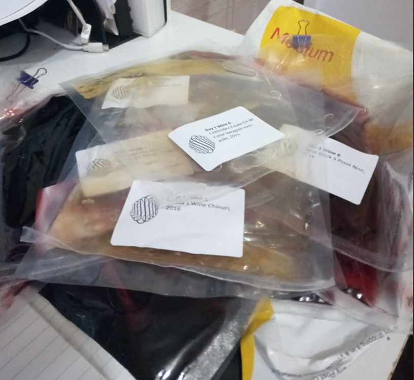 This year, I completed an intensive subject called Wines of the World at university. It was postponed many times due to restrictions, and the subject coordinators eventually decided that they would have to host the course entirely online. A key component of the subject was wine tasting, and this photo shows how this was made possible at home. Wine tastings in sous vide bags were posted to each student's house, a quite exciting and novel experience. This photo thus reflects how educators have had to be flexible around restrictions, and come up with new ways to facilitate learning.