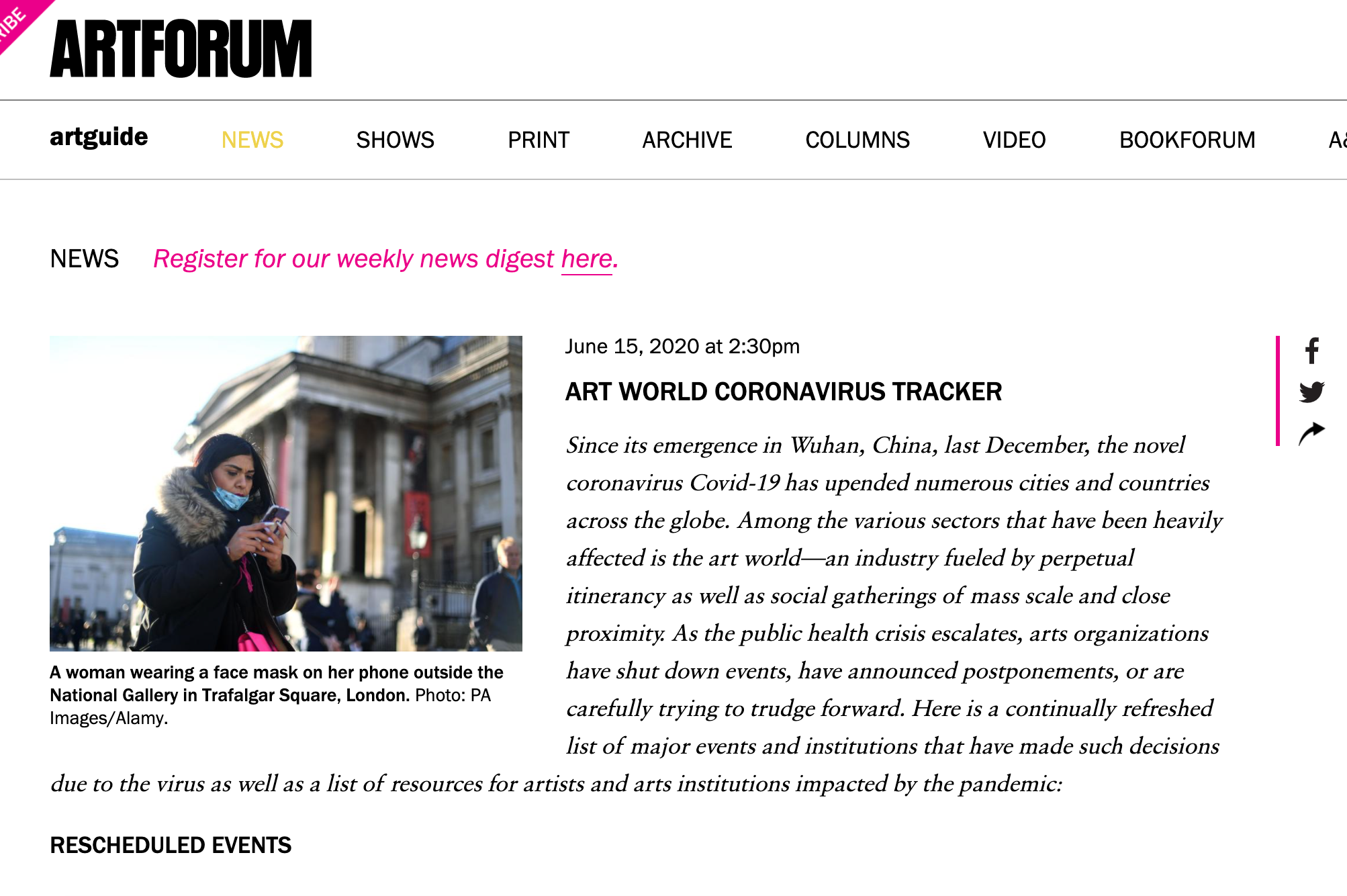 This Artforum article lists the Rescheduled and Canceled Events in 2020 as of June 15, 2020. It also includes funds and organizations working to help artists and art institutions in addition to museum and gallery closures and those open for appointments.