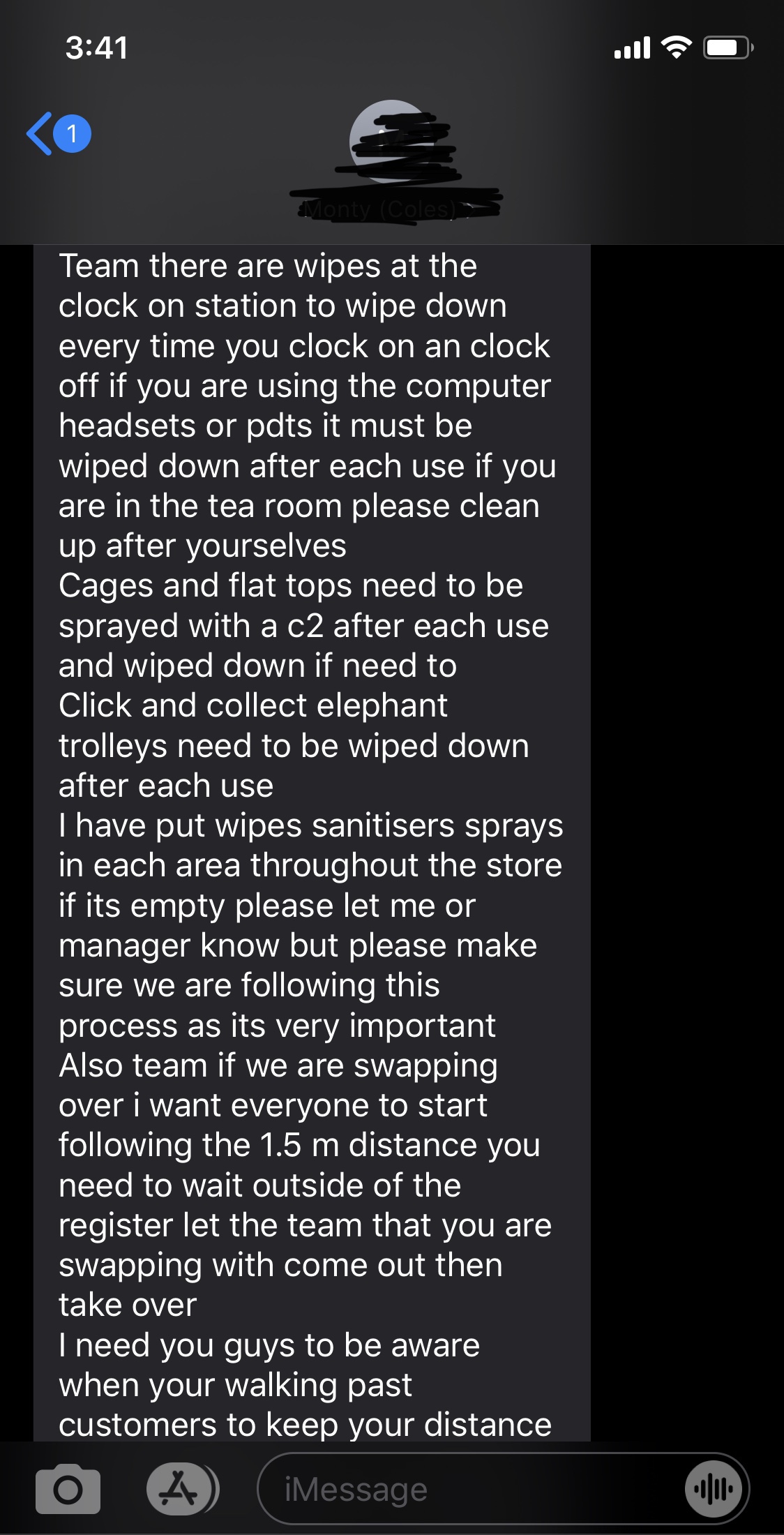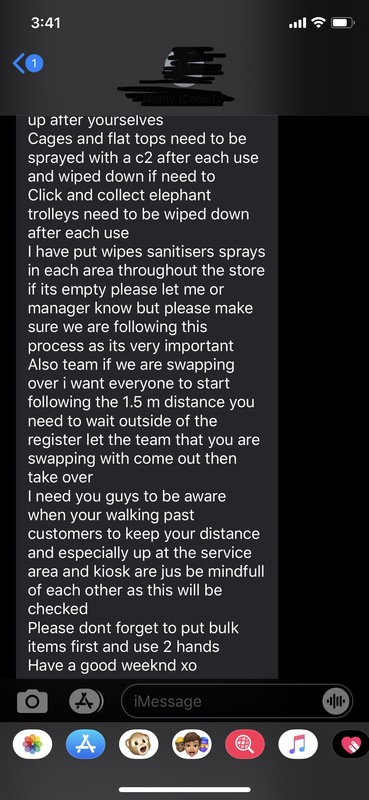 These are screenshots of text messages sent from a supermarket manager to a group chat of service team members of a major Australian supermarket in Altona North, Melbourne. They detail the new cleaning regime that became part of the responsibilities of working in a supermarket during the pandemic. These include instructions about wiping down surfaces with sanitiser and keeping 1.5m distance from coworkers. These texts came a few days after Victoria's third lockdown was announced. I worked at the supermarket at the time and it was an extremely chaotic period, made more hectic by ever-changing restrictions and developments in COVID-safe practices. We would get texts like these quite frequently during this third lockdown because it was so important that supermarket essential workers kept abreast of COVID developments and worked to make supermarkets as safe as possible.