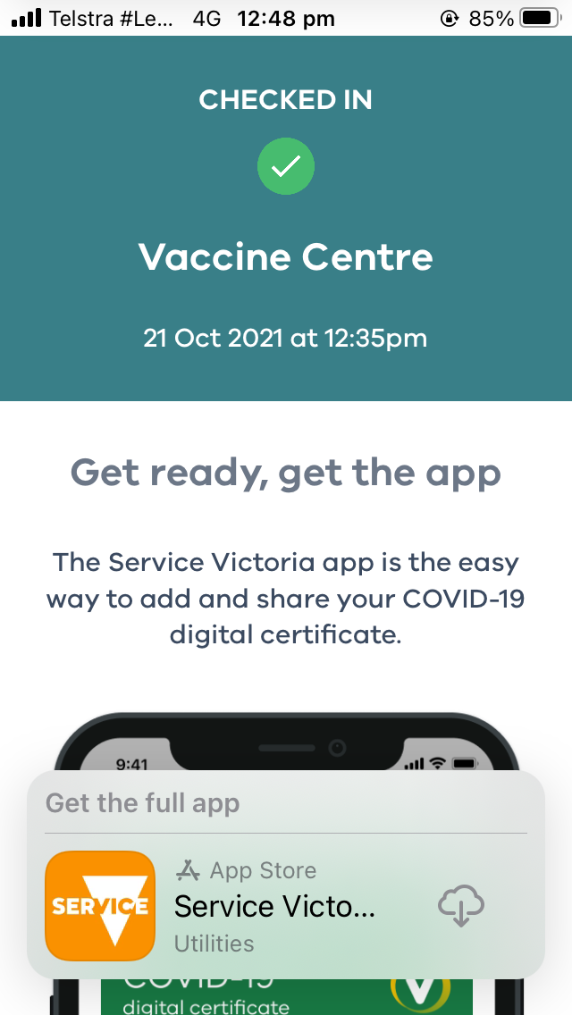 This is a screenshot from my iPhone when I checked into the Melbourne Convention Centre for my second dose of the vaccine. Throughout the Convention Centre, there were several lines with staff directing where to check in, what lines to go into for various brands of the vaccine, as well as a more personal data like ID and Medicare cards. This screenshot shows one of the check points, where staff would direct you to sign in, wait patiently, and then once you showed them the green checkmark, would then allow you to move onwards. At the bottom of the screenshot, there is a prompt directing me to “get the full app” of Service Victoria on my phone, even though I already had it installed. HIST30060.