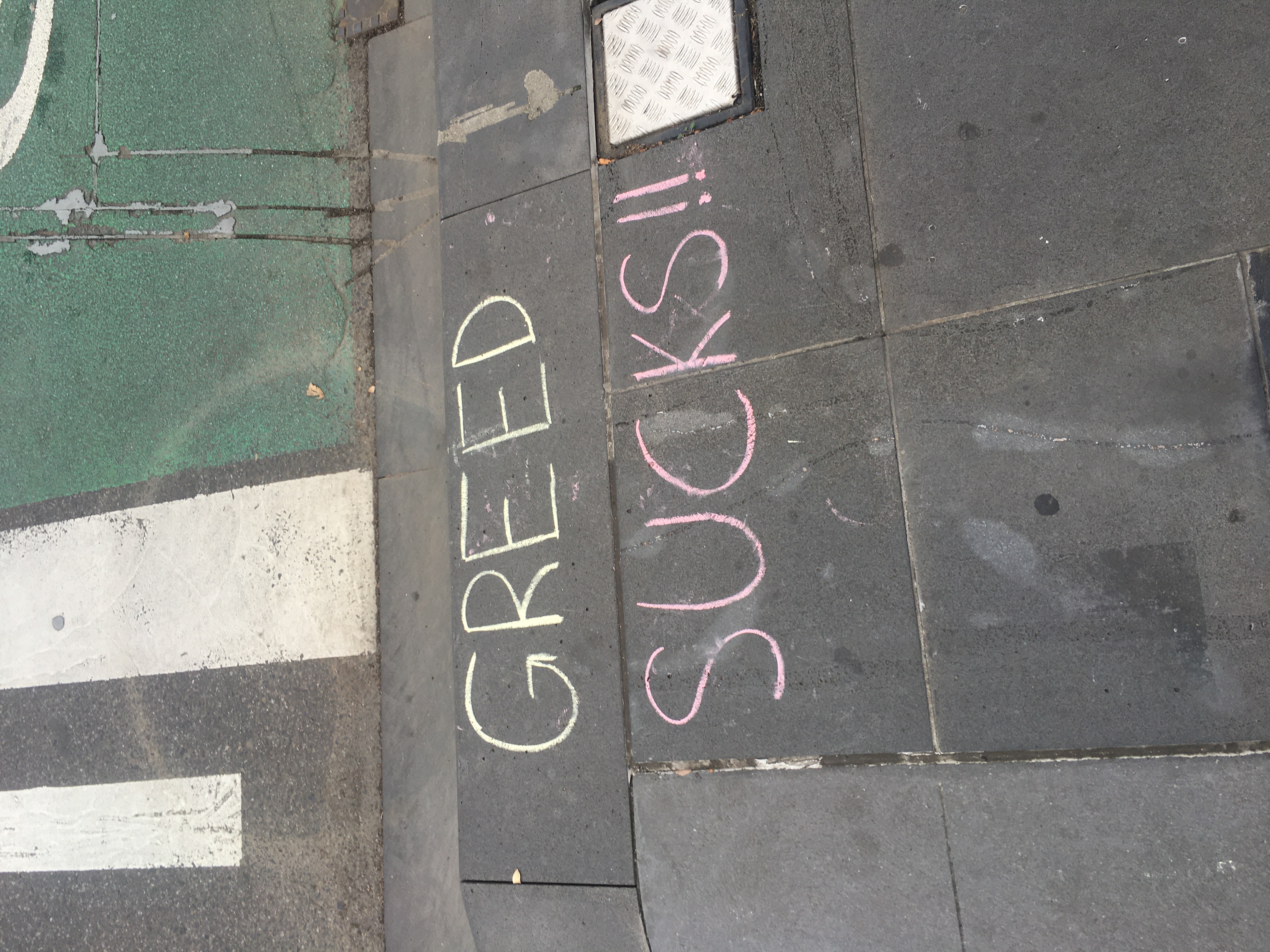 I found this chalk slogan on the road hilariously neo-liberal. Absolutely, greed sucks - the way COVID-19 exacerbated wealth inequalities and ravaged communities disproportionately (due to lack of resources/access and over-policing) sucks. Yet, this chalked slogan was a simplification (or even armchair activist representation) of that reality and this made me chuckle.