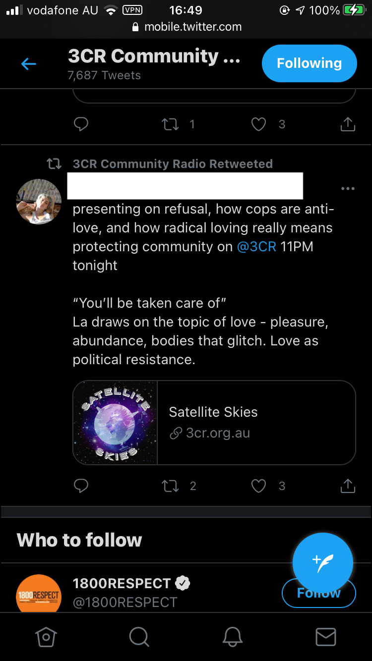 I am a radio presenter and producer and during the lockdowns in Naarm/Melbourne I had to learn how to remote record and broadcast my content. I found myself hushing my housemates in order to record hour-long content from my headphone mic, very solo and DIY. It felt good to be part of a greater community project, broadcasting punk, DIY, and political chat to our regular listeners through the lockdowns.