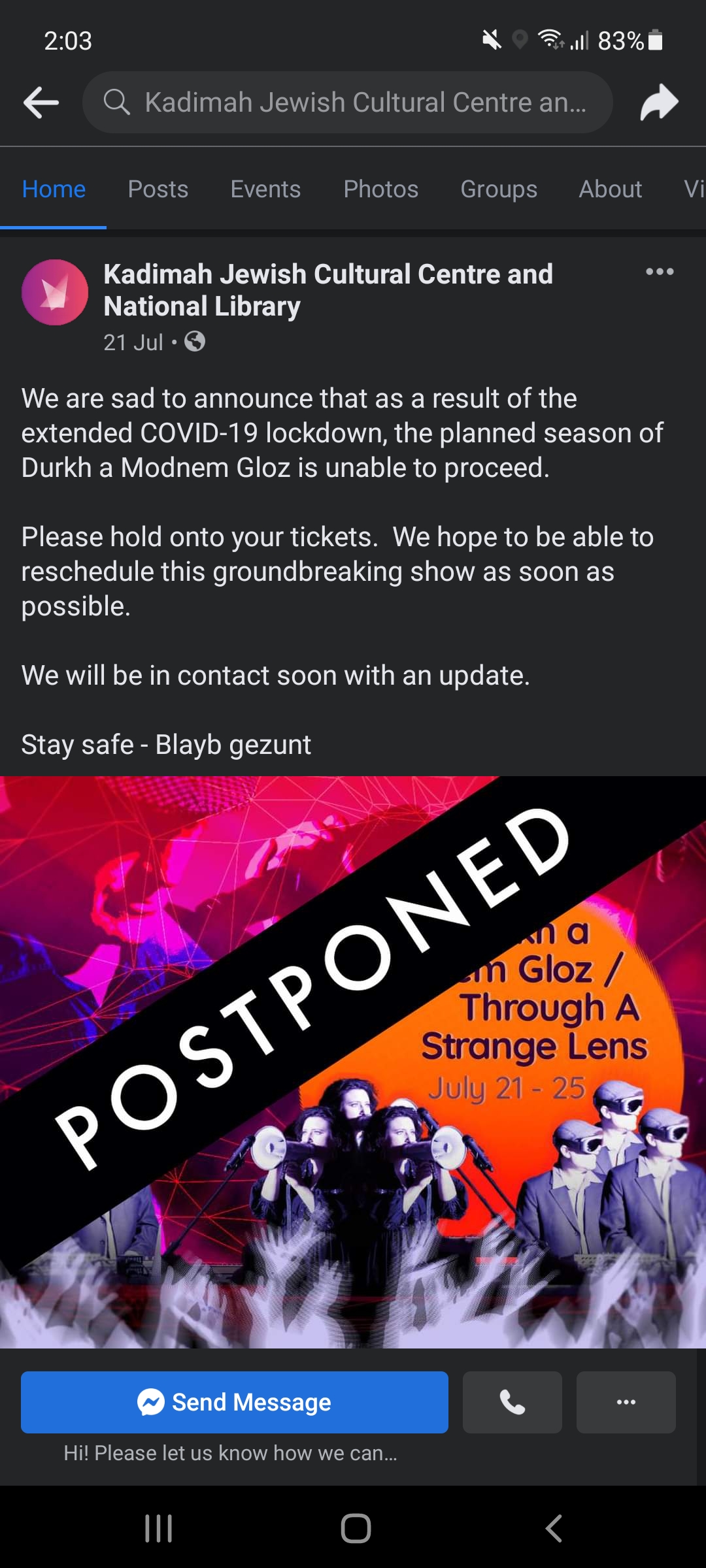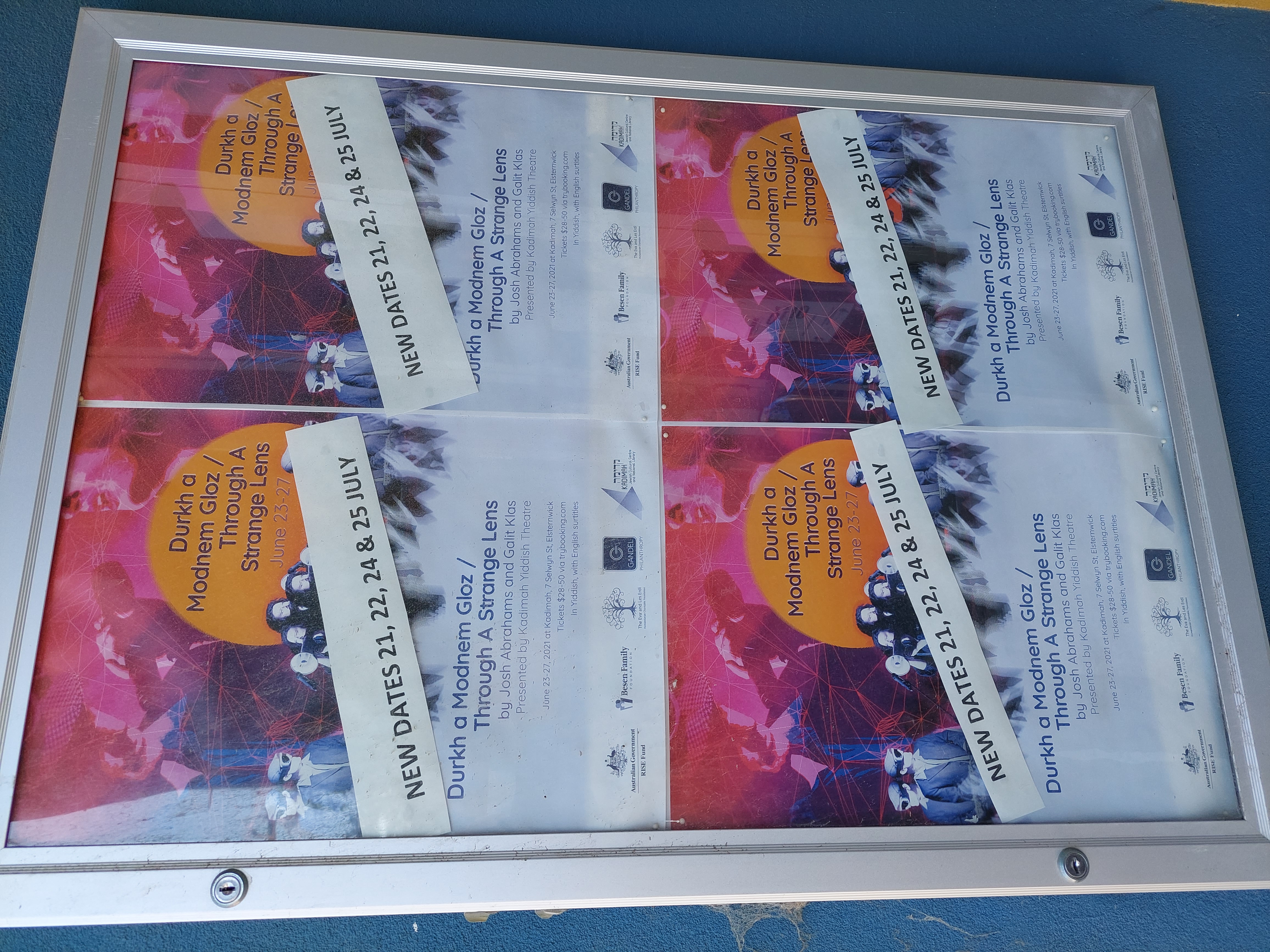As seen in the first image, the original performance dates were listed June 23-27, but was postponed to July 21-25 due to insufficient rehearsal time, thanks to the lockdown ending 10th June. With a new lockdown coming into effect on Thursday 15th of July, new dates were again required. In the Facebook post on the 21st of July (screenshotted and posted here), the Kadimah Jewish Cultural Centre officially announced the postponement. These new dates were set for August 4-8, but the opening night was the only show performed as Lockdown 6 was announced and came into effect on Thursday 5th. Now with that lockdown finally over, will ‘Durkh A Modne Gloz’ finally get the full season it deserves?