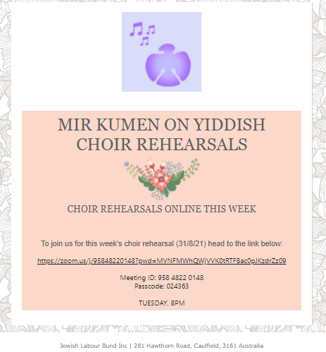 The 'Mir Kumen On' Yiddish Choir, affiliated with the Jewish Labour Bund Melbourne, migrated to Zoom at the beginning of the pandemic and returned there at each lockdown and, depending on the how restrictions affected singing indoors, during non-lockdown periods.