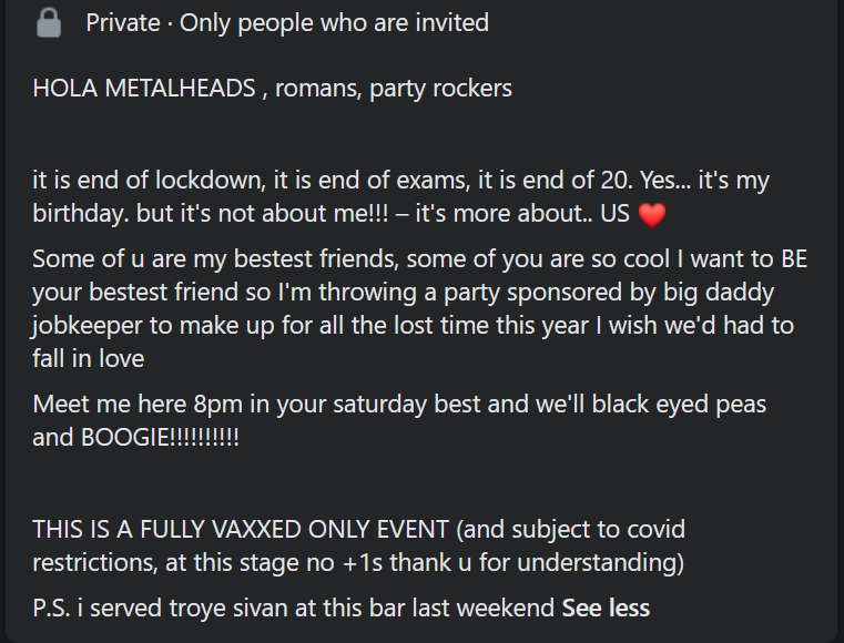 The screenshot for a post lockdown birthday shows the enthusiasm for reopening and recommencing social life, but is tempered by the restrictions still in place.