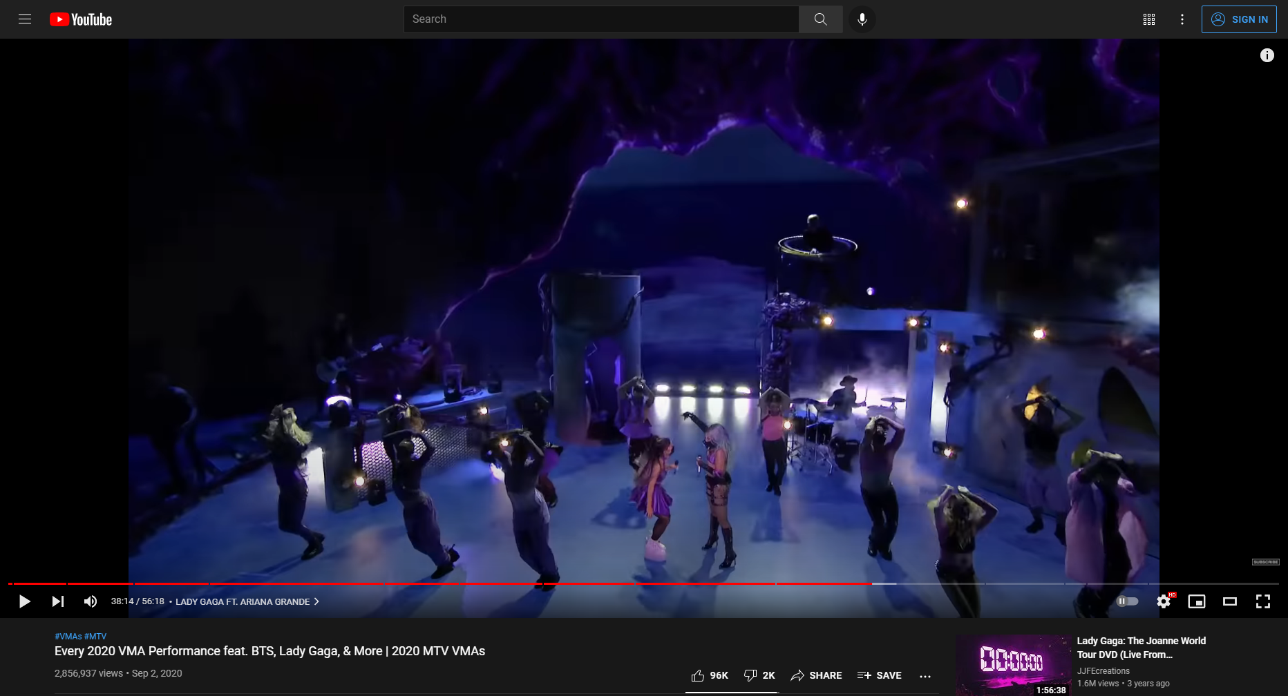In a year that saw tens of thousands of live performances cancelled across the world, the music industry grappled with how to adapt to the covid cimate. The 2020 MTV VMAs (Video Music Awards) showcased the innovations undertaken by performers in order to continue their work. Masks were a particularly big theme, used not only for protection but also as part of costuming in Lady Gaga and Doja Cat's performances. The lack of a designated stage also allowed for creative set pieces, such as The Weeknd performing on a rooftop filmed by helicopter, the ultimate social distance filming. Watching the VMAs and these live performances was incredibly uplifting for music fans who had missed out on concerts, and although the pandemic was far from over when this was recorded, it was a needed semblance of hope for the arts community.
