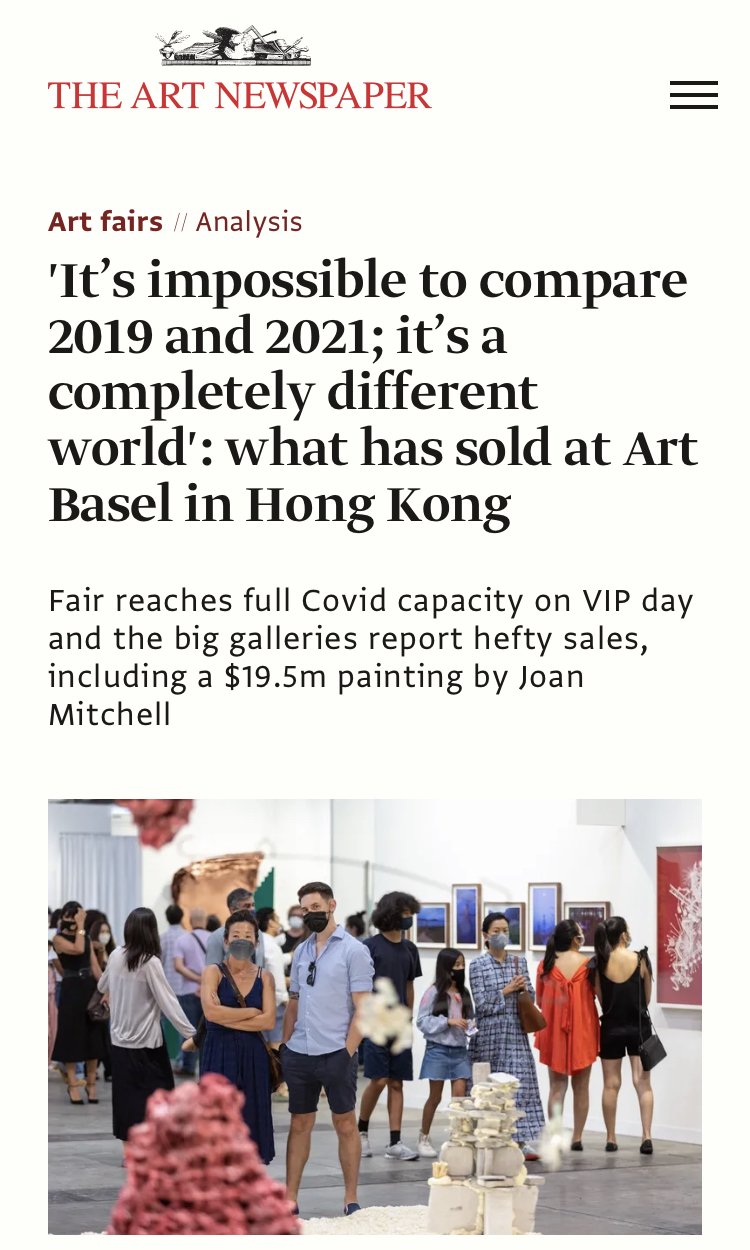 Art Basel, Hong Kong did finally happen in person in May 2021. In the article, Lisa Movius discusses the reception to the hybrid-model art fair, the change in demographic, noteworthy sales, and spotlighted works, artists, and gallery booths.