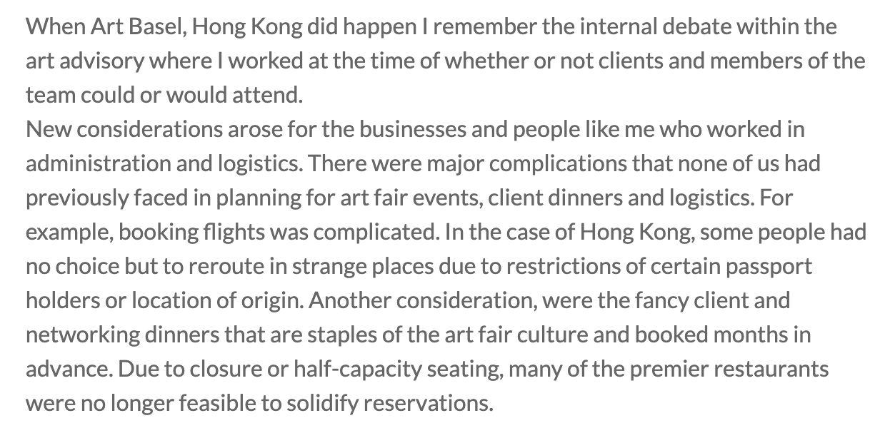 When Art Basel, Hong Kong did happen I remember the internal debate within the art advisory where I worked at the time of whether or not clients and members of the team could or would attend.