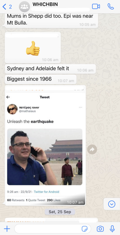 Lockdown shifted the nature of community dynamics in our local area. We live in a peri-urban region on the outskirts of the Yarra Ranges; as such, neighbouring properties are separated by large swathes of Australian bush. This can be isolating at times; it’s very different to suburban living. Our street (which spans about 7kms) and adjacent streets have a WhatsApp group chat named ‘Fireguard’, which allows residents to share information about fire safety, planned burn-offs and emergency warnings. However, during lockdown the chat was increasingly used for the purposes of socialisation. Suddenly, distant neighbours began sharing jokes and engaging in conversations about lockdown living, through the chat. The chat became a site of social interaction that the members of our area probably didn’t realise they needed, until they did. We eventually decided to create a separate chat for general/social purposes only, the title ‘WHICHBIN’ constituting a friendly inside joke about one particular chat member who never fails to ask, “which bin?” she needs to put out for collection each week.