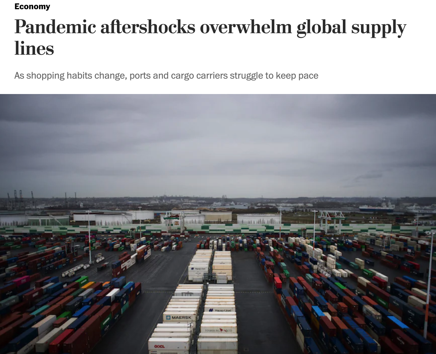 The Washington Post article discusses the disruptions in the supply chain and the repercussions such as inflated prices, failure to meet schedules, and effects on different industries. The domino effect was set off by the pandemic but we continue to see the fallout.