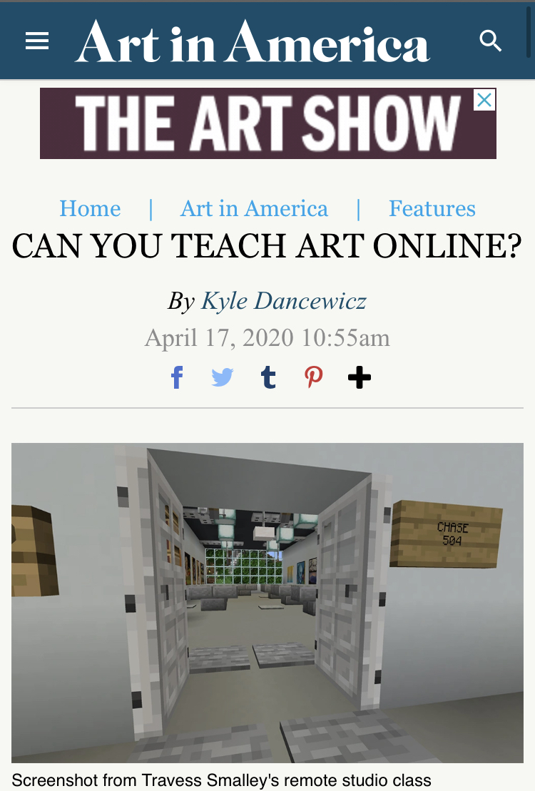 “Can You Teach Art Online?”, published on Art in America online, examines the questions artists-instructors are asking amidst a transfer to online learning. Different instructors who teach in various mediums are interviewed and expose difficulties of teaching art virtually as well as the positives and new innovations that have come out of necessity. I found the argument by Carissa Rodriguez, a Harvard professor in the arts, very interesting. She discussed the limitations of platforms like Zoom and how it is difficult to engage others in an artistic subject behind a screen. Rodriguez teaches a screen-based artistic medium and she explains that for her subject matter “the platform seems a notch too self-reflexive, collapsing screenings, critiques, and discussions onto the equalizing plane of her students’ monitors, the same site where they browse social media and binge-watch TV shows”.