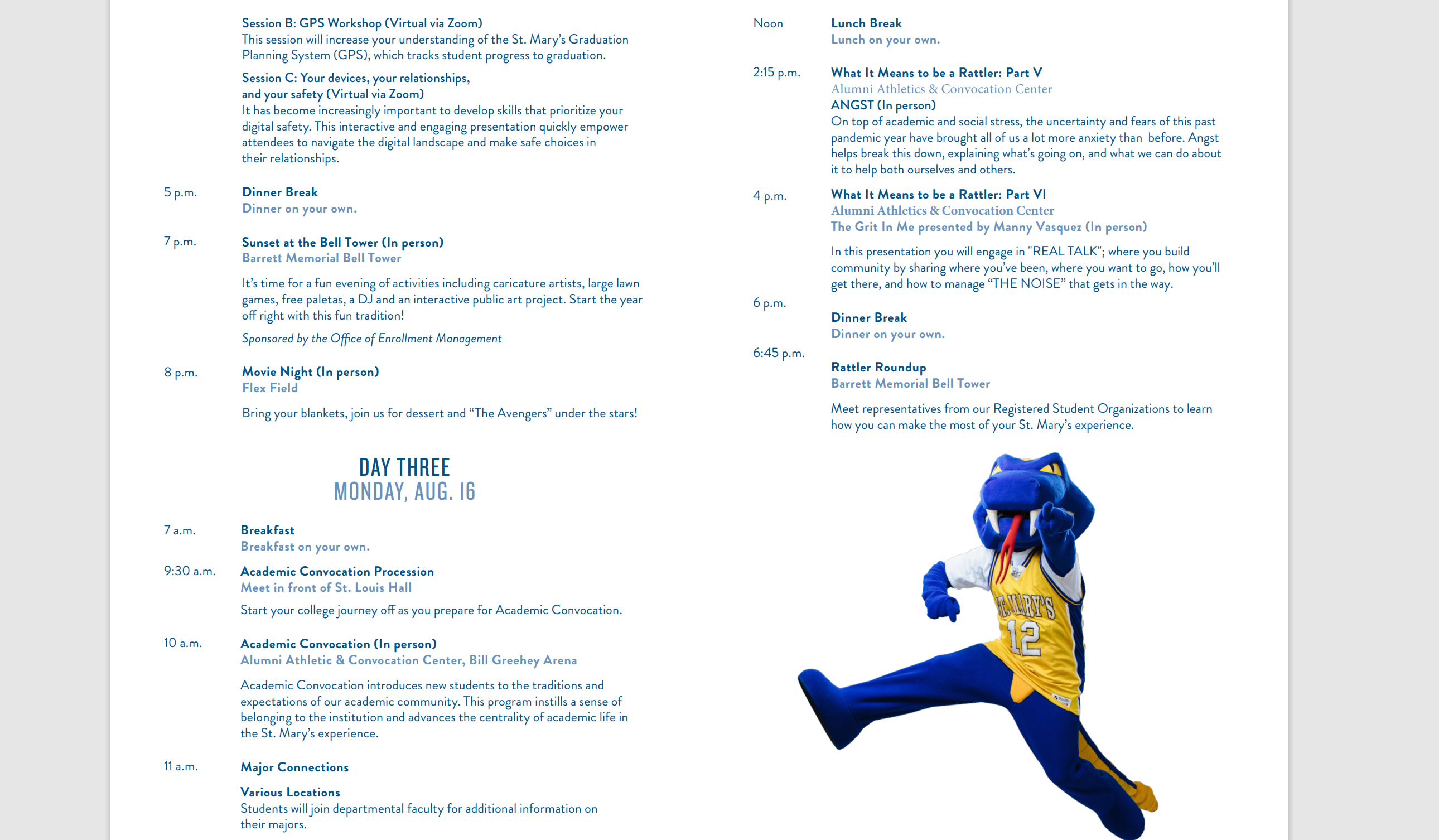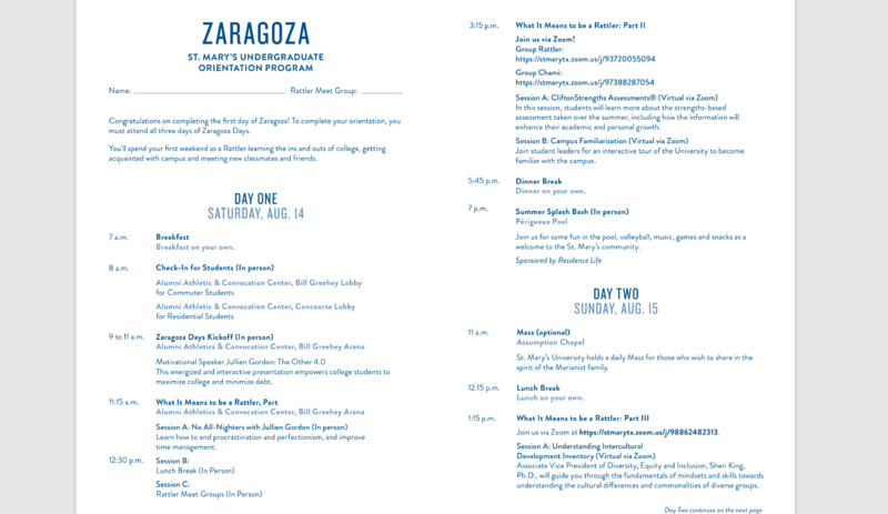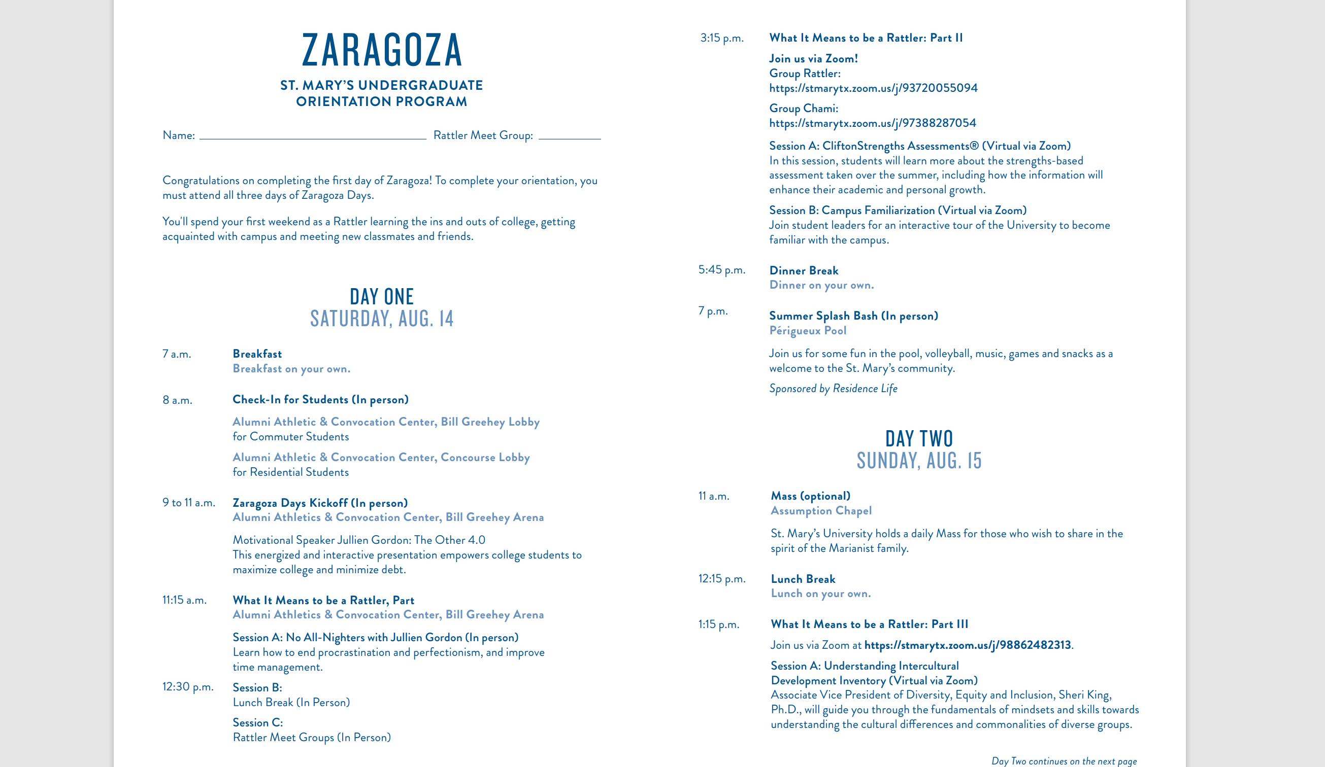 This orientation program shows the different accommodations that have been made to ensure a safe experience during Zaragoza days. Prior to the pandemic, the events scheduled for students would be held in person so that students would have the opportunity to interact face to face and make new connections with other students. However, the Zaragoza days held in August 2021 integrated both in person and online orientation events. This program shows that some of the scheduled events were held on Zoom during different sessions. This was to ensure that students were provided with safe and easy access to learn more about being and undergrad at St. Mary's while not completely limiting their orientation experience by still holding in person events that adhered to Covid-19 guidelines.