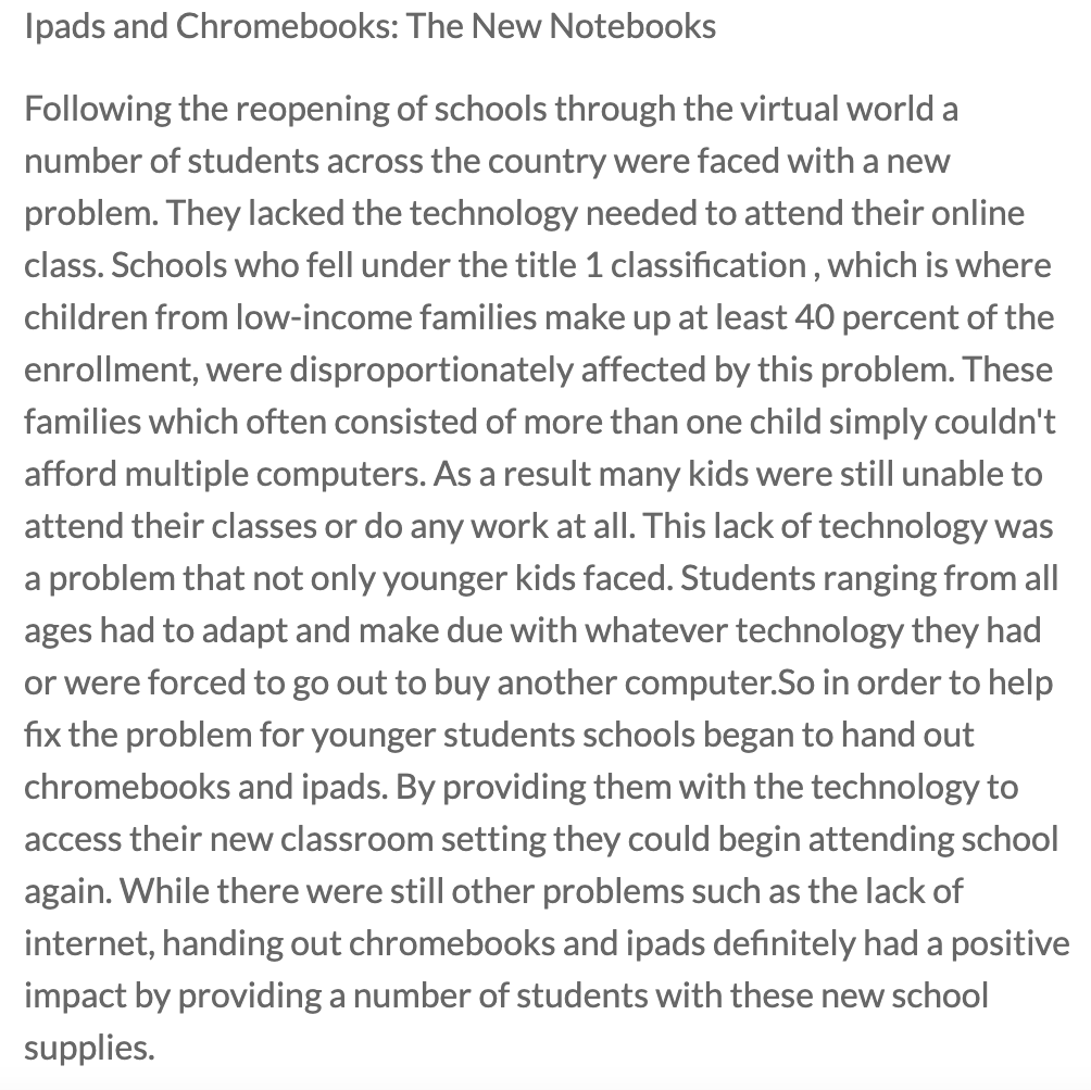 Following the reopening of schools through the virtual world a number of students across the country were faced with a new problem. They lacked the technology needed to attend their online class. Schools who fell under the title 1 classification , which is where children from low-income families make up at least 40 percent of the enrollment, were disproportionately affected by this problem. These families which often consisted of more than one child simply couldn't afford multiple computers. As a result many kids were still unable to attend their classes or do any work at all. This lack of technology was a problem that not only younger kids faced. Students ranging from all ages had to adapt and make due with whatever technology they had or were forced to go out to buy another computer.So in order to help fix the problem for younger students schools began to hand out chromebooks and ipads. By providing them with the technology to access their new classroom setting they could begin attending school again. While there were still other problems such as the lack of internet, handing out chromebooks and ipads definitely had a positive impact by providing a number of students with these new school supplies.