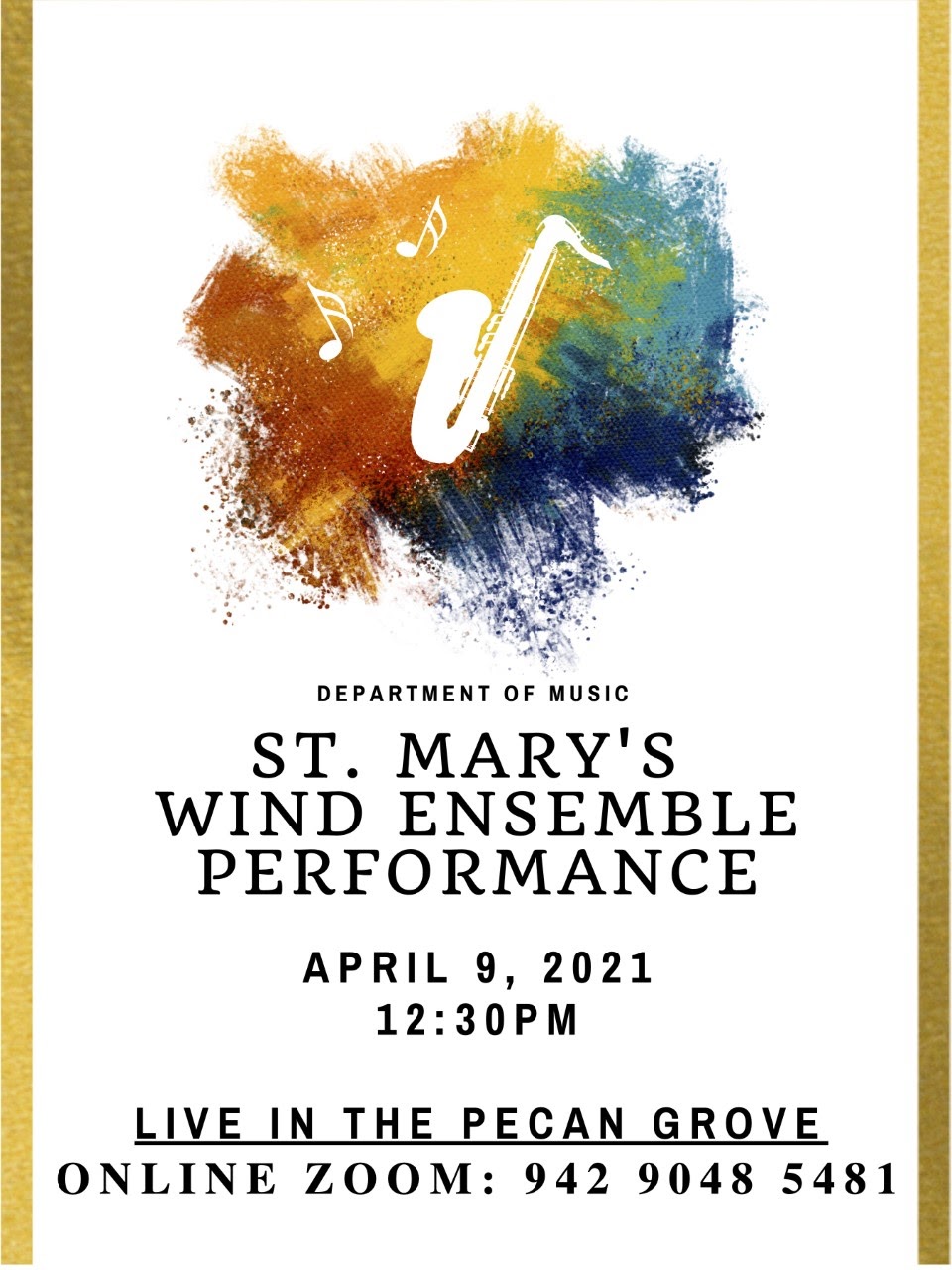 This image is advertising the spring 2021 wind ensemble concert at St. Marys University. The location of the performance was in the Pecan Grove, one of the outdoor areas at the university. This is a sign that the band is trying to return to normal. However, there are several indicators that precautions are still being taken. The outdoor location tells us that the band is trying to protect both members of the band and those in the audience. The included zoom link also tells us that the band is considering those who might be uncomfortable with attending in person. So the band is clearly in a transitionary period, where they are trying to move back to normal but haven’t quite reached it yet.