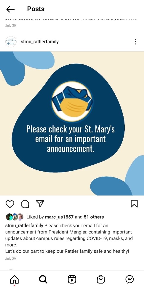 This Instagram posts shows the University's attempt to reach out to the St.Mary’s community advising them about safety precaution for the summer. Prior to the pandemic, events for Zaragzoa were not required to consider maks requirements, vaccination and health test records, or social distancing. However, with the priority of keeping the student staff and new students safe, the University used social media as a way to adequately reach out to the community to inform them of where they can find updates about safety precautions. They did this by posting a simple visual that showed a rattler wearing his mask and asking students to check on their email for updates.