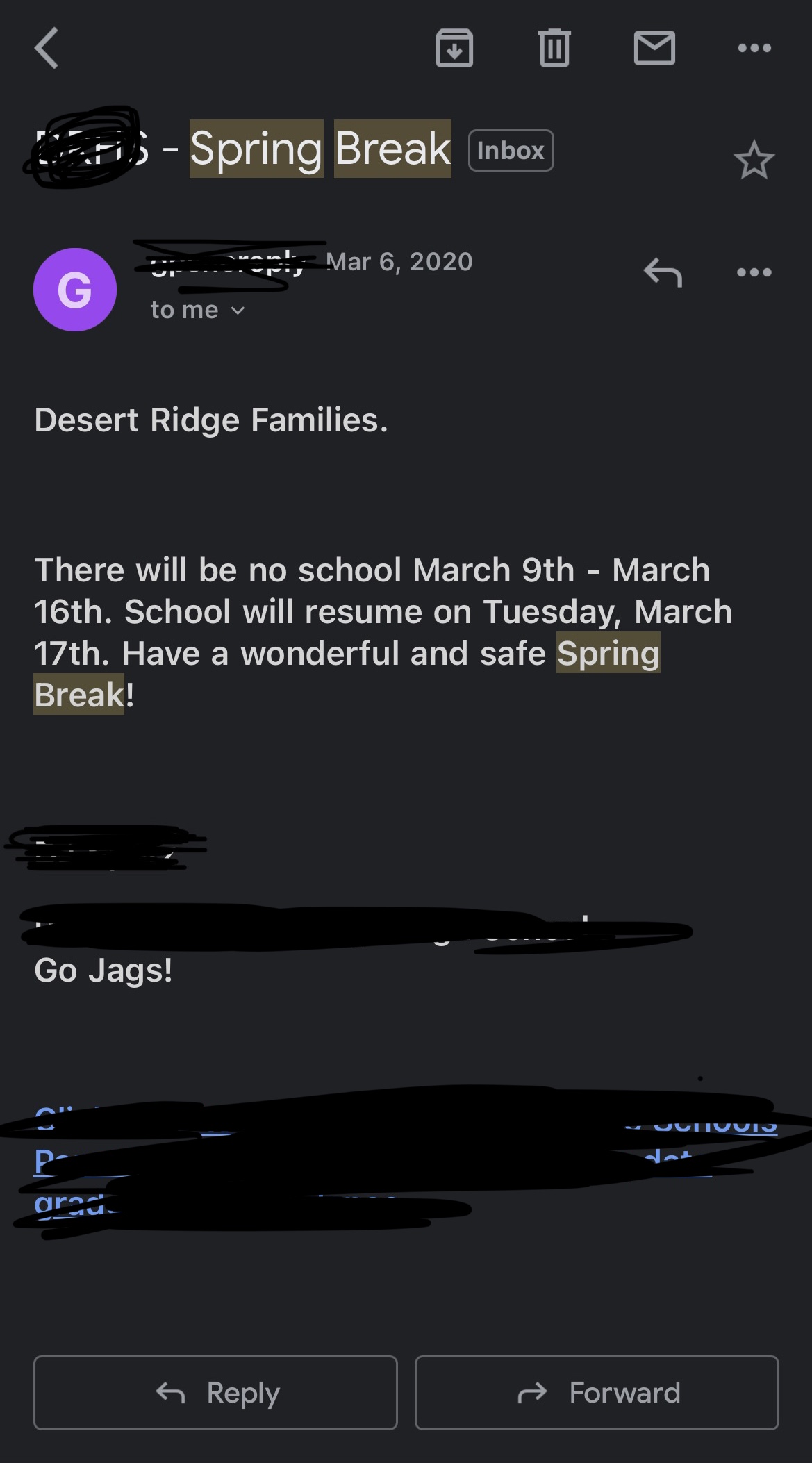 I was at my grandmas house with my siblings because my parents had work that day and needed someone to watch us. I was watching tik tok when our phones buzzed. I was in a cushy white lazy boy chair with a white throw blanket wrapped around me. The email detailed that we would get an extra week of spring break. We were so happy we got an extra couple days of break thinking we’d go back after a week or two. While this email isn’t the exact email they sent us that told us they were extending spring break, it shows how we were supposed to have a normal spring break. There was only supposed to be one week of spring break, but now I know the exact spot where I was sitting when the world nearly fell apart.
