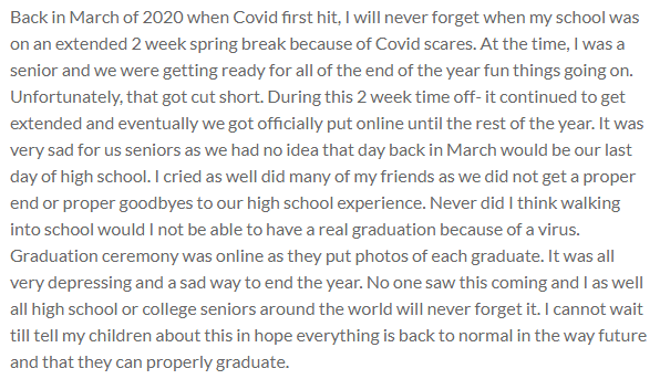 Back in March of 2020 when Covid first hit, I will never forget when my school was on an extended 2 week spring break because of Covid scares. At the time, I was a senior and we were getting ready for all of the end of the year fun things going on. Unfortunately, that got cut short. During this 2 week time off- it continued to get extended and eventually we got officially put online until the rest of the year. It was very sad for us seniors as we had no idea that day back in March would be our last day of high school. I cried as well did many of my friends as we did not get a proper end or proper goodbyes to our high school experience. Never did I think walking into school would I not be able to have a real graduation because of a virus. Graduation ceremony was online as they put photos of each graduate. It was all very depressing and a sad way to end the year. No one saw this coming and I as well all high school or college seniors around the world will never forget it. I cannot wait till tell my children about this in hope everything is back to normal in the way future and that they can properly graduate.