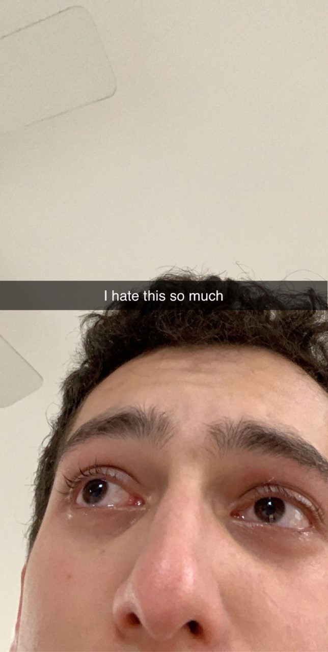 On March 31st 2020, my state governor, J.B. Pritzker announced that school would be out of session till the 30th of April. I was a senior in high school, and hearing that broke my heart as the last day of school for the seniors was May 8th 2020. The biggest year of most young adults lives is their senior year of high school, as it signifies their last moments of childhood before embracing adulthood. I was in my mother's bedroom sitting on her bed with my sister watching the live newscast. My sister was a freshman in college at the time and about two weeks before had to clear out her dorm room and bring it all home shortly after her Spring Break had ended. She didn't have a particular reaction to it, not that I can remember. After the governor stated that school was out for another month, I began to cry. My mother cried for me, as she knew how much I had been looking forward to my senior year, and graduation, and prom. While I was crying and watching the newscast continue on, I took a photo of myself on Snapchat, and typed out "I hate this so much". I did hate it, because there was nothing I could have done about it, and I was being robbed of a particularly precious moment in my life. Many seniors in the class of 2020, both high school and college, were robbed of what they deserved that year. I'm submitting this because this is one of many real reactions students in my age group had, and it is important to me since I am currently in college to become a history teacher. I'm living through a historic time that I will be teaching my future students about, and I will use the photos and videos I took as primary sources for it.