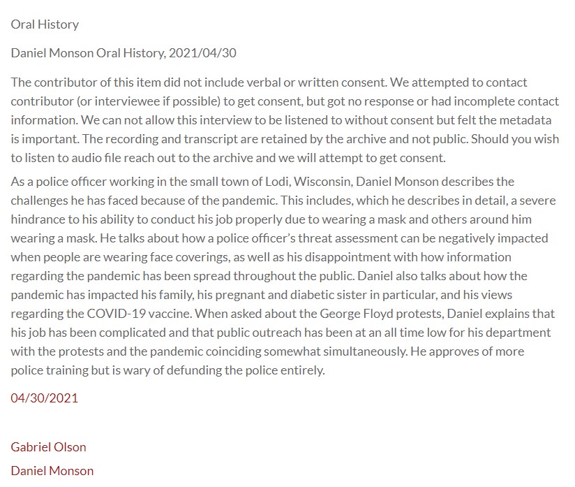 As a police officer working in the small town of Lodi, Wisconsin, Daniel Monson describes the challenges he has faced because of the pandemic. This includes, which he describes in detail, a severe hindrance to his ability to conduct his job properly due to wearing a mask and others around him wearing a mask. He talks about how a police officer’s threat assessment can be negatively impacted when people are wearing face coverings, as well as his disappointment with how information regarding the pandemic has been spread throughout the public. Daniel also talks about how the pandemic has impacted his family, his pregnant and diabetic sister in particular, and his views regarding the COVID-19 vaccine. When asked about the George Floyd protests, Daniel explains that his job has been complicated and that public outreach has been at an all time low for his department with the protests and the pandemic coinciding somewhat simultaneously. He approves of more police training but is wary of defunding the police entirely.
